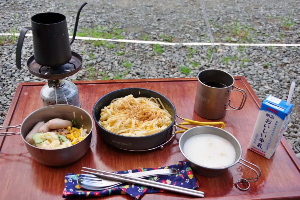 朝食➡やっちまった。朝食用に買っておいたパンを忘れてきてしまった。非常食用の乾麺(うどん)は持っていたので、あとは手持ちの食材と調味料でなんとかするしかない。で、できたのがカルボナーラ風うどん。目玉焼き用に持ってきた卵とマヨネーズ、ブラックペッパーを使って、なんとか完成。やればできるじゃん・・・