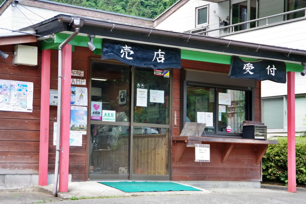 受付と売店のある管理棟。受付は8:00~17:00。売店には薪、炭、ガスカートリッジ、着火剤、調味料、カップ麺、お菓子、アルコール飲料、ソフトドリンク、菓子、氷、サンダル、水遊びグッズなど。キャンプ用の消耗品はだいたい揃っている。