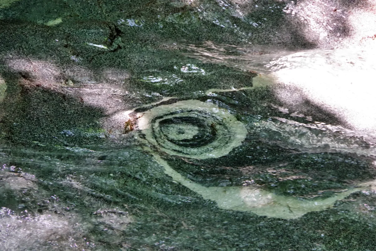 確かに的のような三重の円の模様が川底の岩にはっきりと見ることができる。そして的様の下流には的様の滝があり、高さは7mほどだが水量は多く、白砂の滝壺も美しい。毎年4月には的様の祭礼が行なわれ、白砂の量によってその年の作物の出来を占っているとのこと。