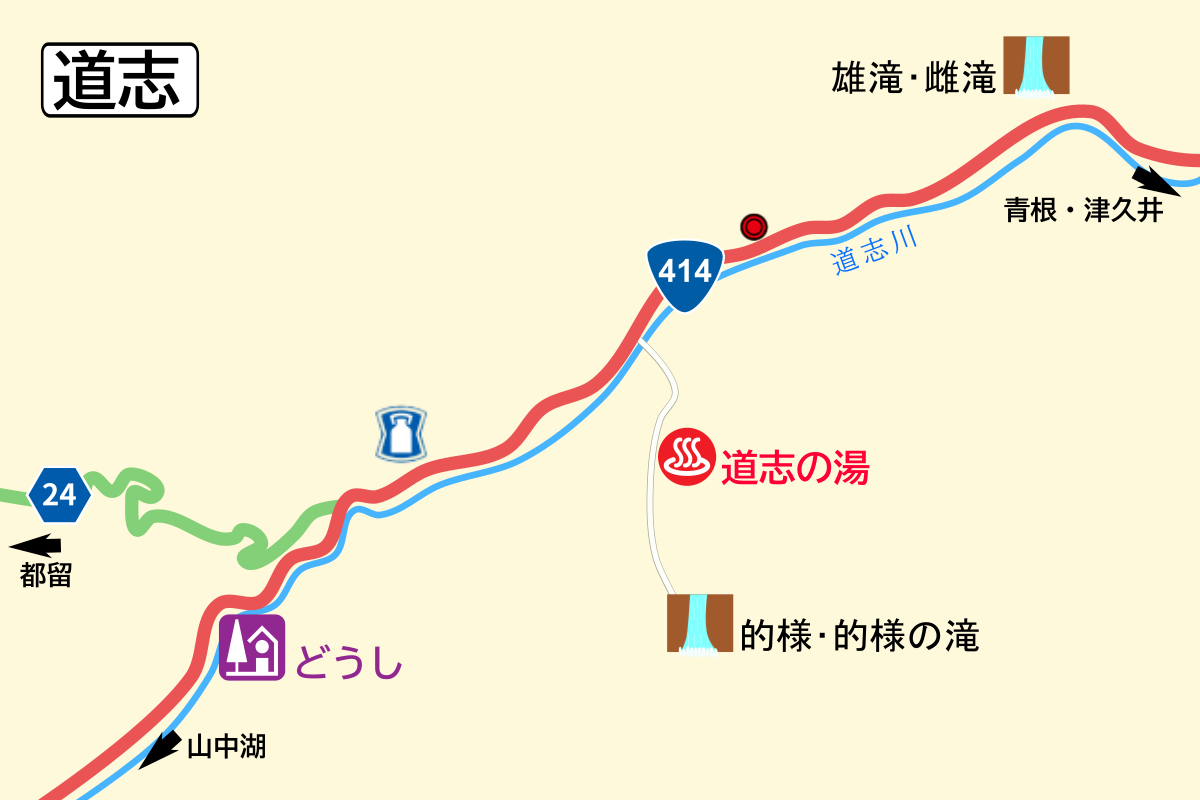 道の駅 どうし(約19km):TEL0554-52-1811 山梨県道志村9745 営 9:00~18:00(キッチンは~16:30) 休 無休(年末年始は休)
