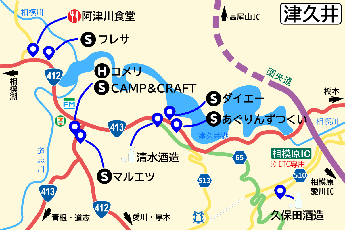 CAMP & CRAFT(約12km):TEL 042-785-6404 神奈川県相模原市緑区三ケ木300-2 営 9:00~17:00 休 木曜