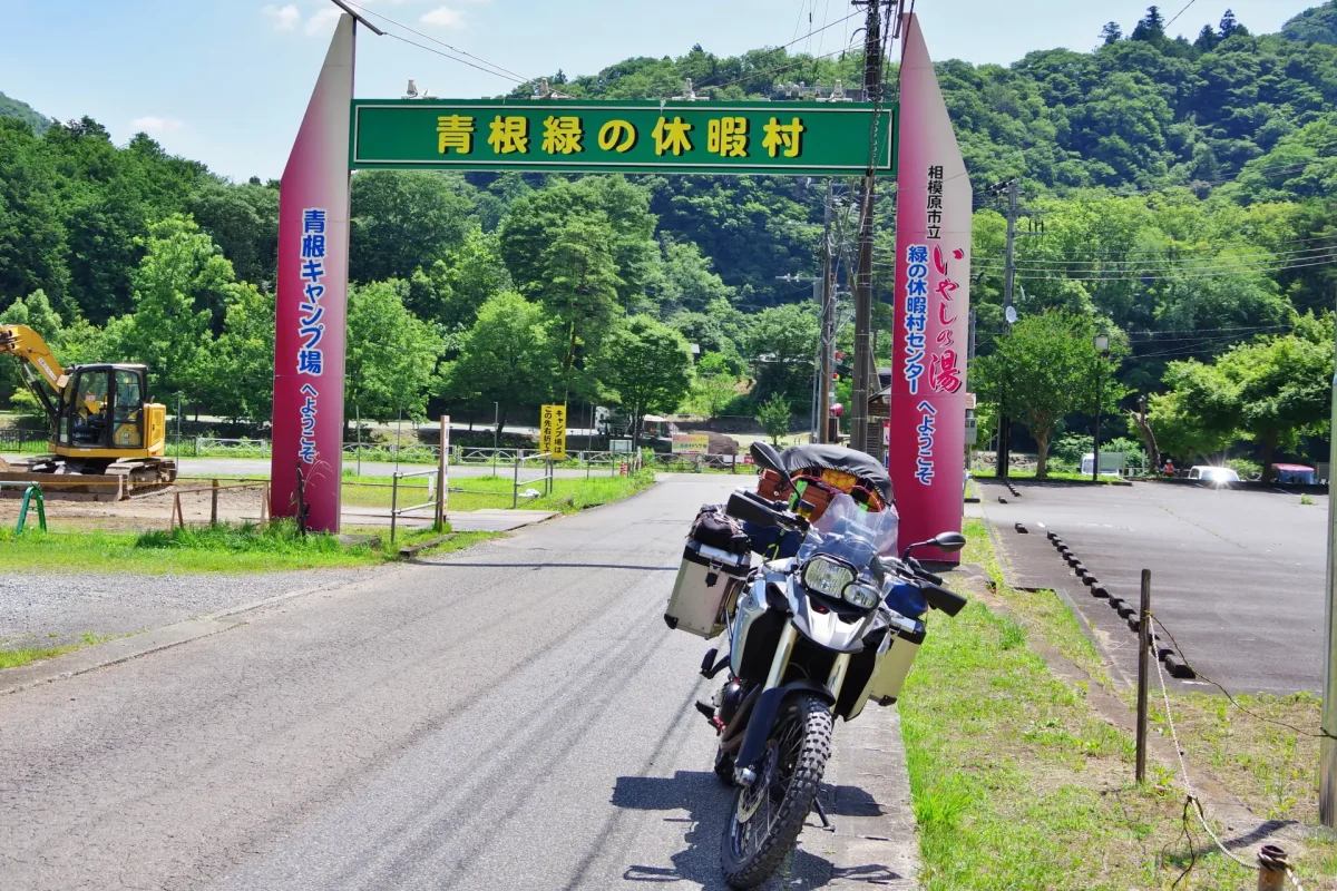 緑の休暇村にはキャンプ場に隣接して日帰り温泉「いやしの湯」がある。この日は気温30℃を超えていたのでテントを設営したら、この温泉で汗を流してプシュッといきたかったが、残念なことに改修工事のため2025年4~12月は休館となっている。それでも近くにもう1軒、「藤野やまなみ温泉」があるので、そちらで汗を流すことができた。道志みち(国道414号)沿いには山梨県側にも「道志の湯」と「紅椿の湯」があるので、温泉ツーリングも楽しめる。