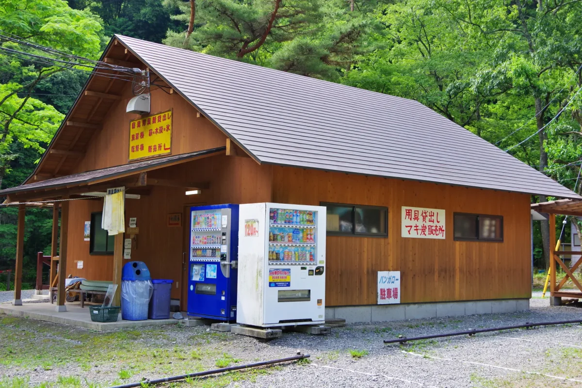 キャンプエリアと管理棟側のバンガローエリアに1カ所ずつある。キャンプ用品のレンタルや薪、炭、氷などもこちらで販売している。券売機があり、借りたいものや買いたいものは券を購入してから。レンタル品はテント、タープ、調理道具各種、毛布、マットなどがある。