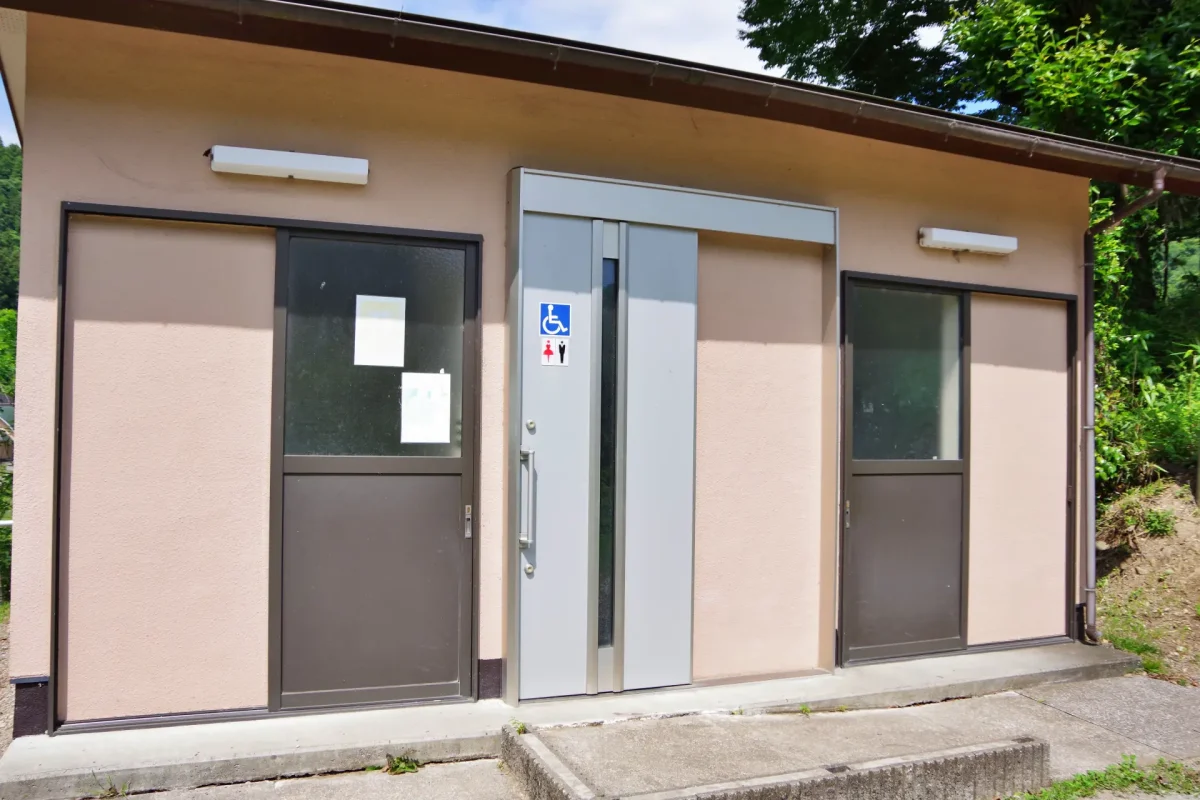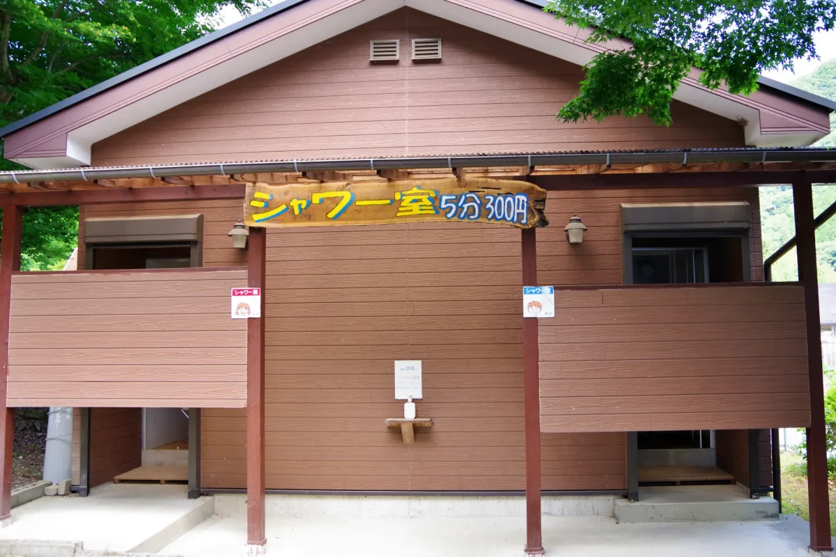 管理棟側のバンガローエリア入口近くにある。キャンプエリアからは橋を渡って行くのでやや遠いが、近くに駐車場もある。