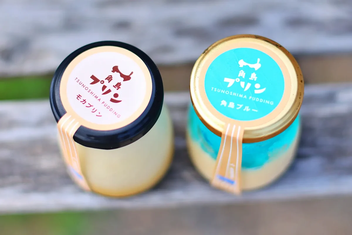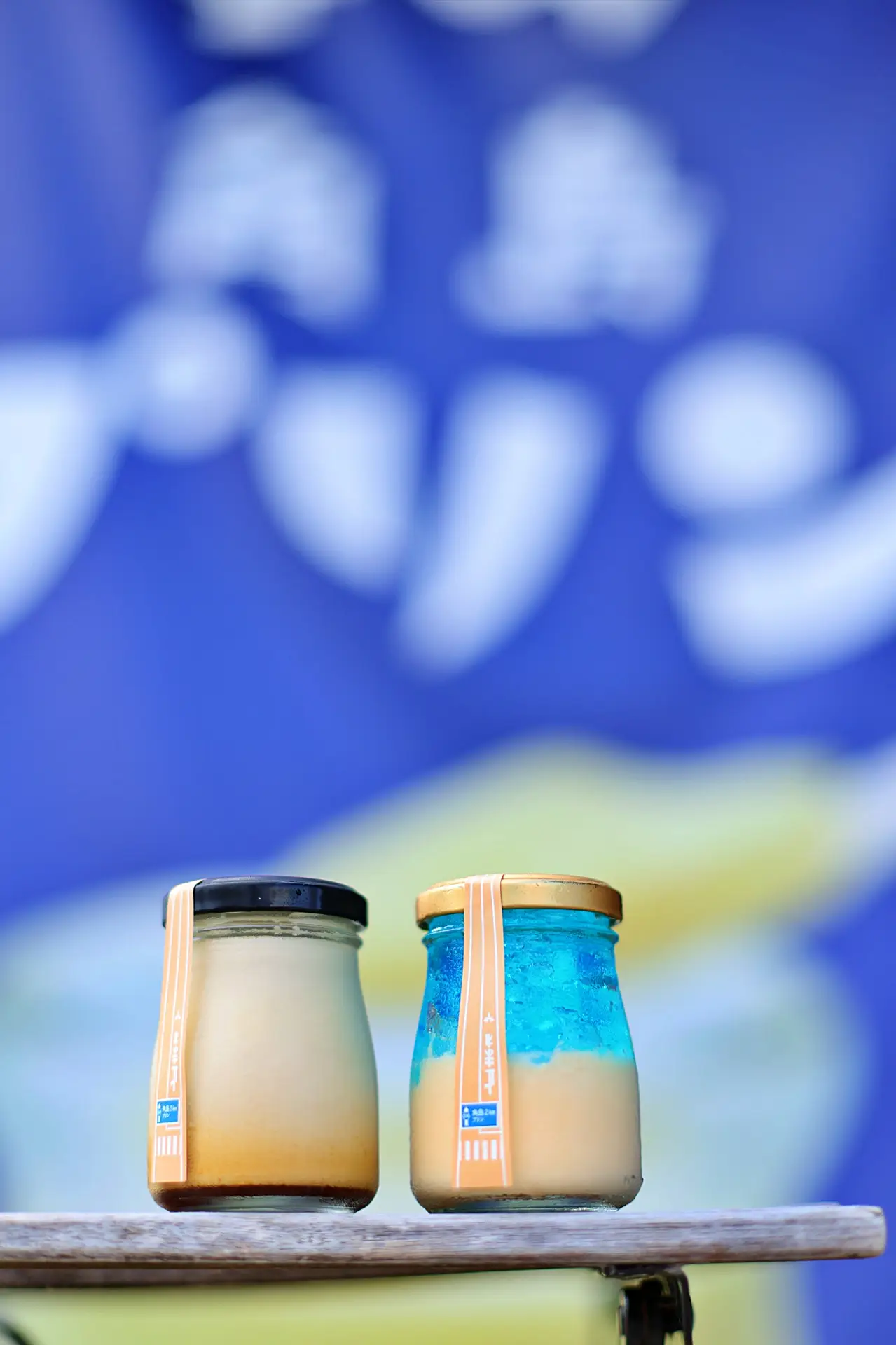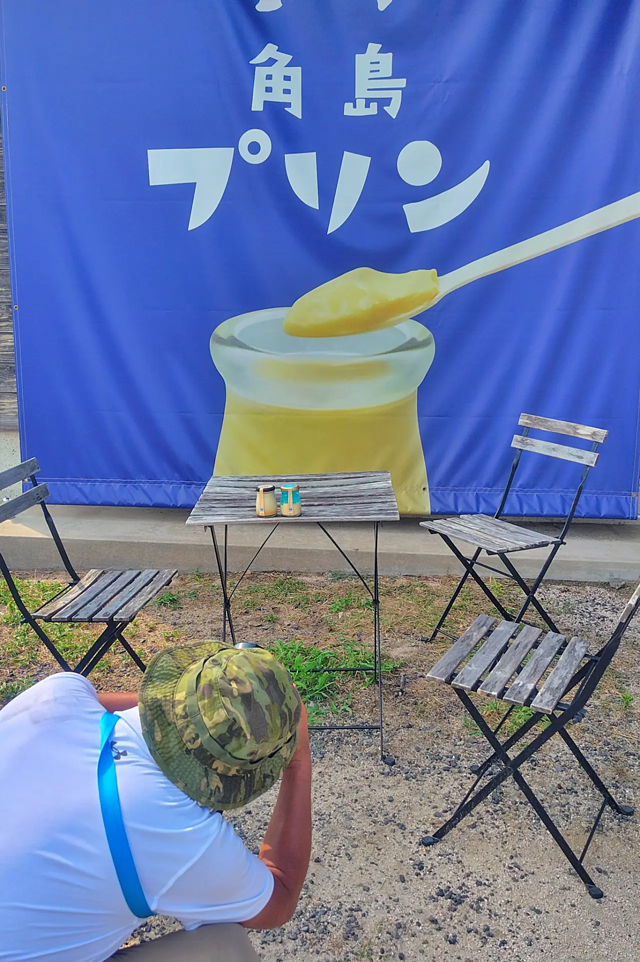山口県下関市の観光スポット、「角島大橋(つのしまおおはし)」のほど近くにある、大人気のプリン屋さんを、今年の表紙撮影時に訪問しました。県道275号沿いの広い敷地に建つ古民家には、青い「角島プリン」の大きなバナーが掲げられ、思わず目を引きます。