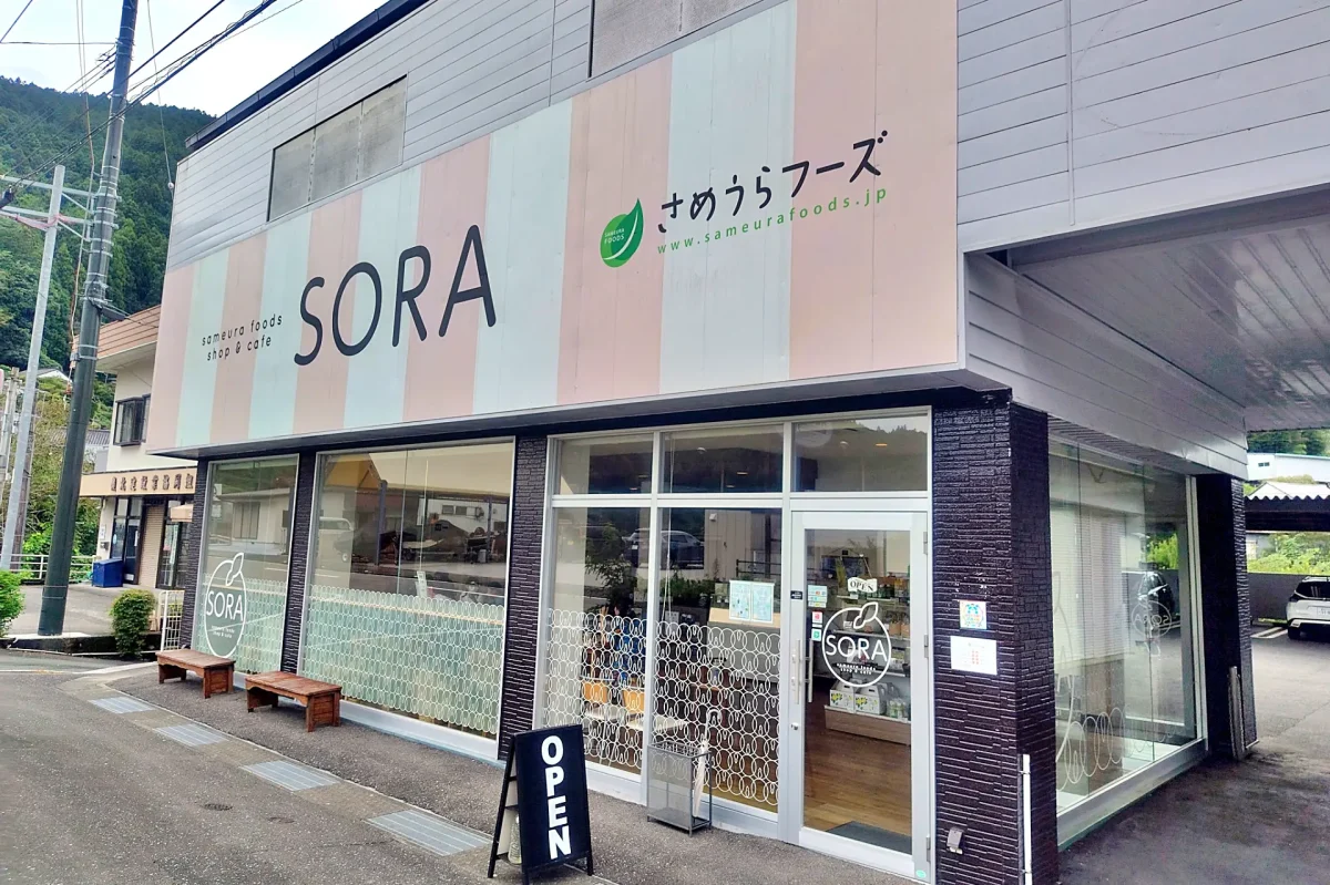 高知県中部の本山町の国道439号沿いにあるさめうらフーズ直営店「SORA」。高知県特産の柚子製品を手掛ける「さめうらフーズ」の直営店で、柚子を使ったパフェやソフトクリーム、ドリンクがいただける休憩スポットで、落ち着いた店内でゆったり涼むことが出来ます。なかでも、逆さのコーンが目を引く30㎝の「SORAソフト」はビックリメニューながら、お財布にも優しいお手頃価格です。