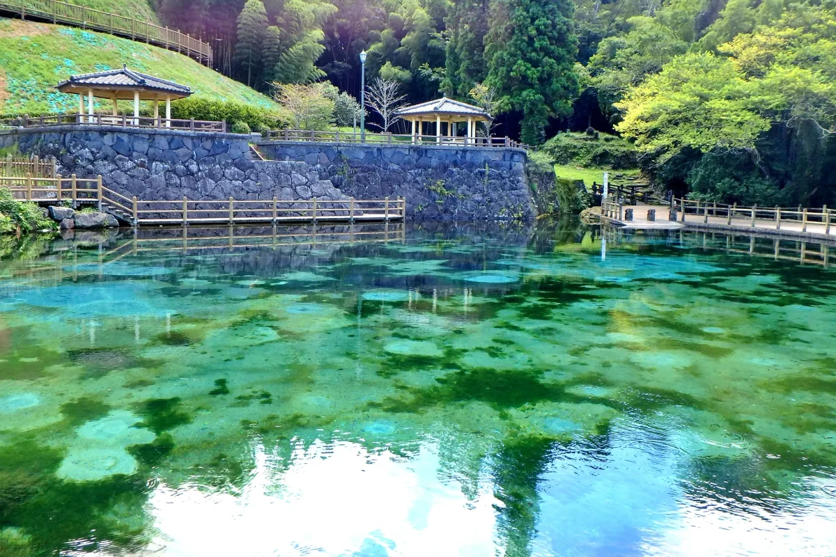 霧島山麓の水が毎日6万tも湧き出す、美しい湧水池で、日本名水百選にも選ばれています。池の周囲には、石畳の遊歩道が整備されていて、湧水池をいろんな角度から見ることができ、その透明度に心を奪われること間違いなし!