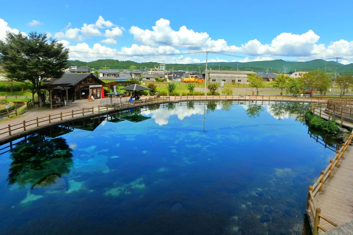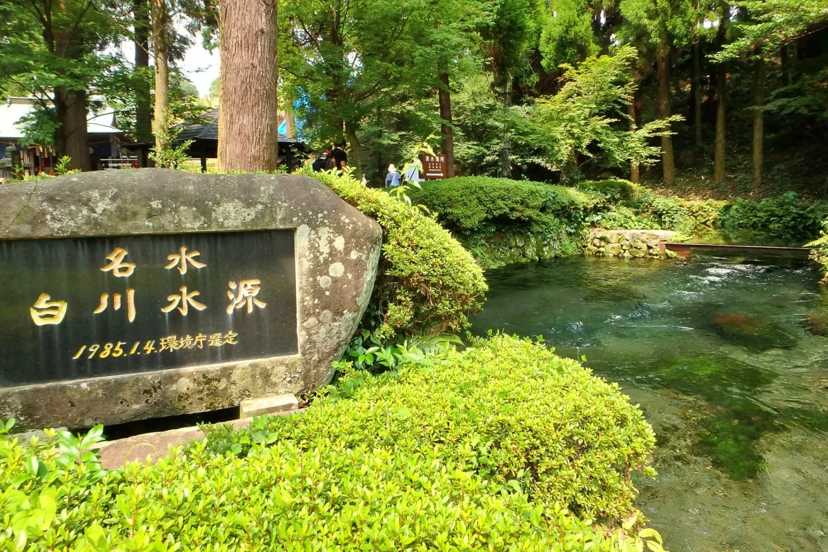 熊本を代表する湧水地のひとつで、環境省の名水百選にも選ばれています。南阿蘇村の中央を流れる清流「白川」の総水源で、毎分60tもの湧水が地底の砂とともに、勢いよく湧き上がる姿はどこか神秘的。近隣には、寺坂水源、竹崎水源など美しい湧水地が点在するので、南阿蘇の湧水めぐりもおすすめです。