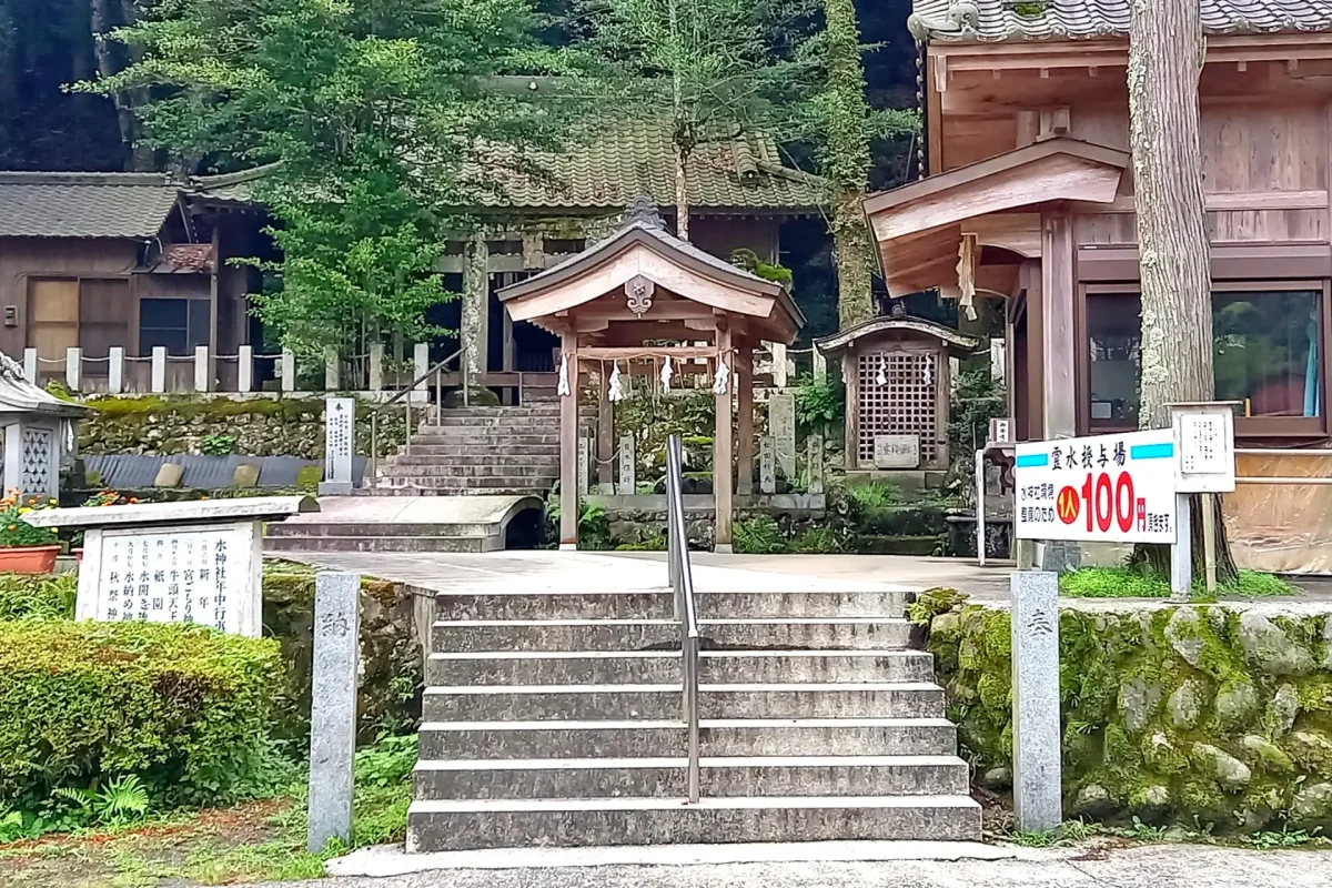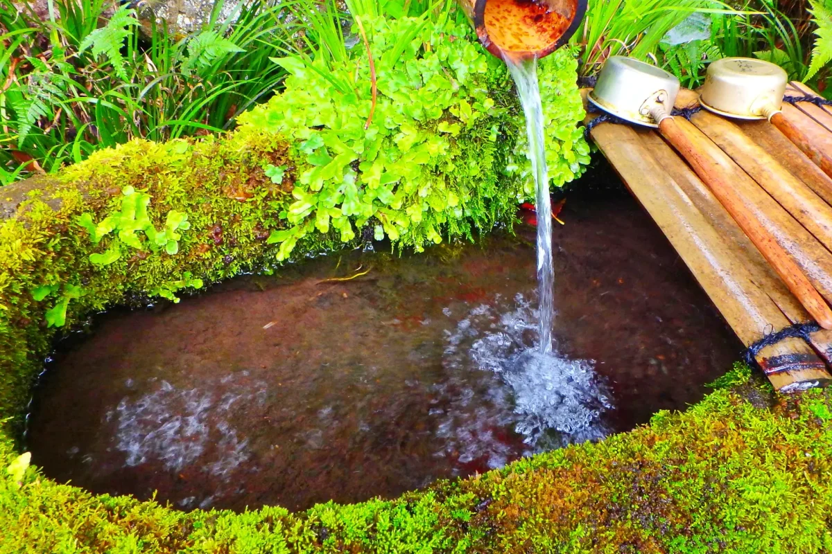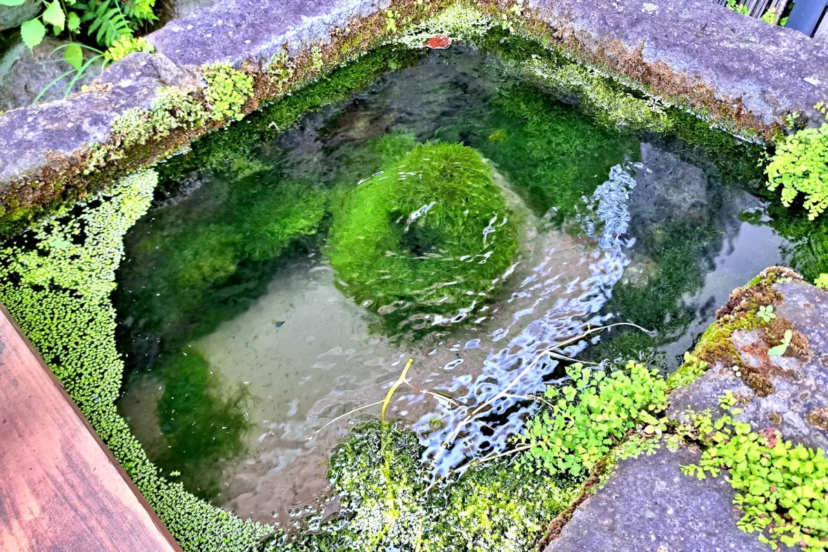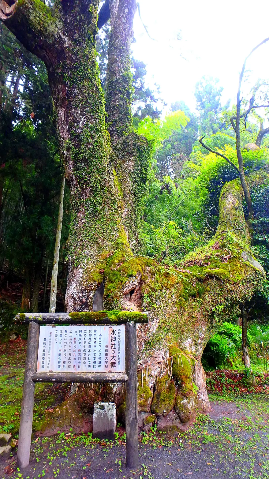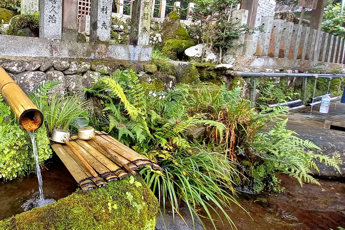 水神社の境内にある樹齢800年を越える大樟の根元から湧出する冷泉は、地域の名水として知られ、1日1000t湧き出ており、日ごろから多くの人が水汲みに訪れています。かつては求菩提の山伏や神官が禊を行う霊水として使われていたようで、今は誰でも飲むことができて、うれしい限りです。神社も大樟も独特の雰囲気があって、何か元気をもらえますよ。
