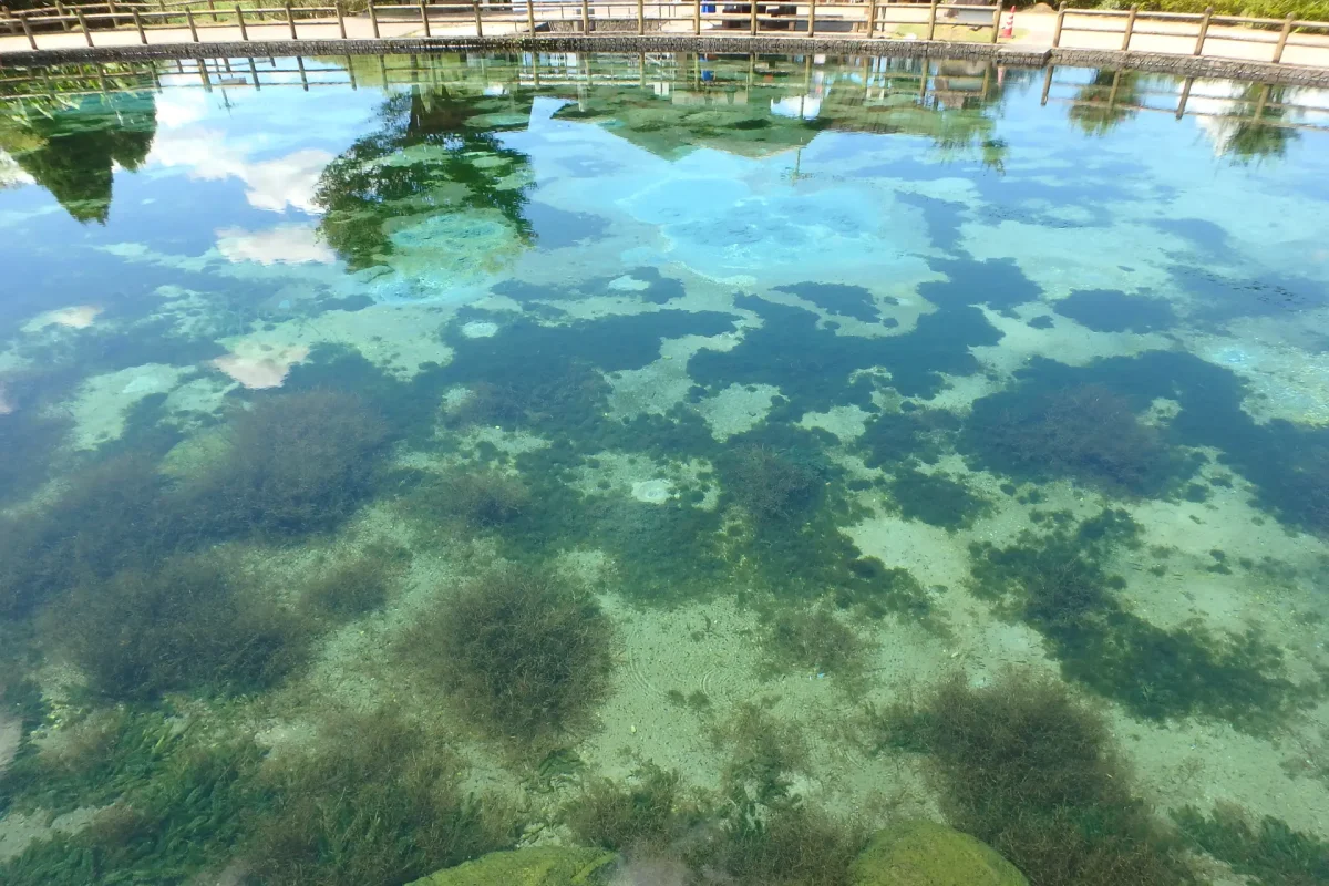 晴れた日の空がそのまま池に映し出される風景は、なんとも言えない美しさです。夏はホタルの名所としても知られ、多くの人が訪れます。湧水池の脇に水汲み場が整備されており、自由に利用できるので、多くの人が訪れる地元では人気の水汲み場です。