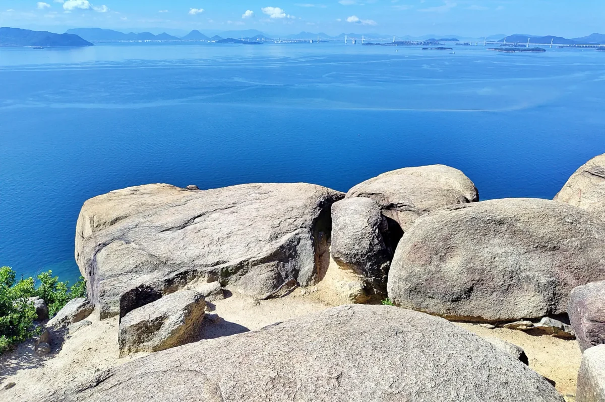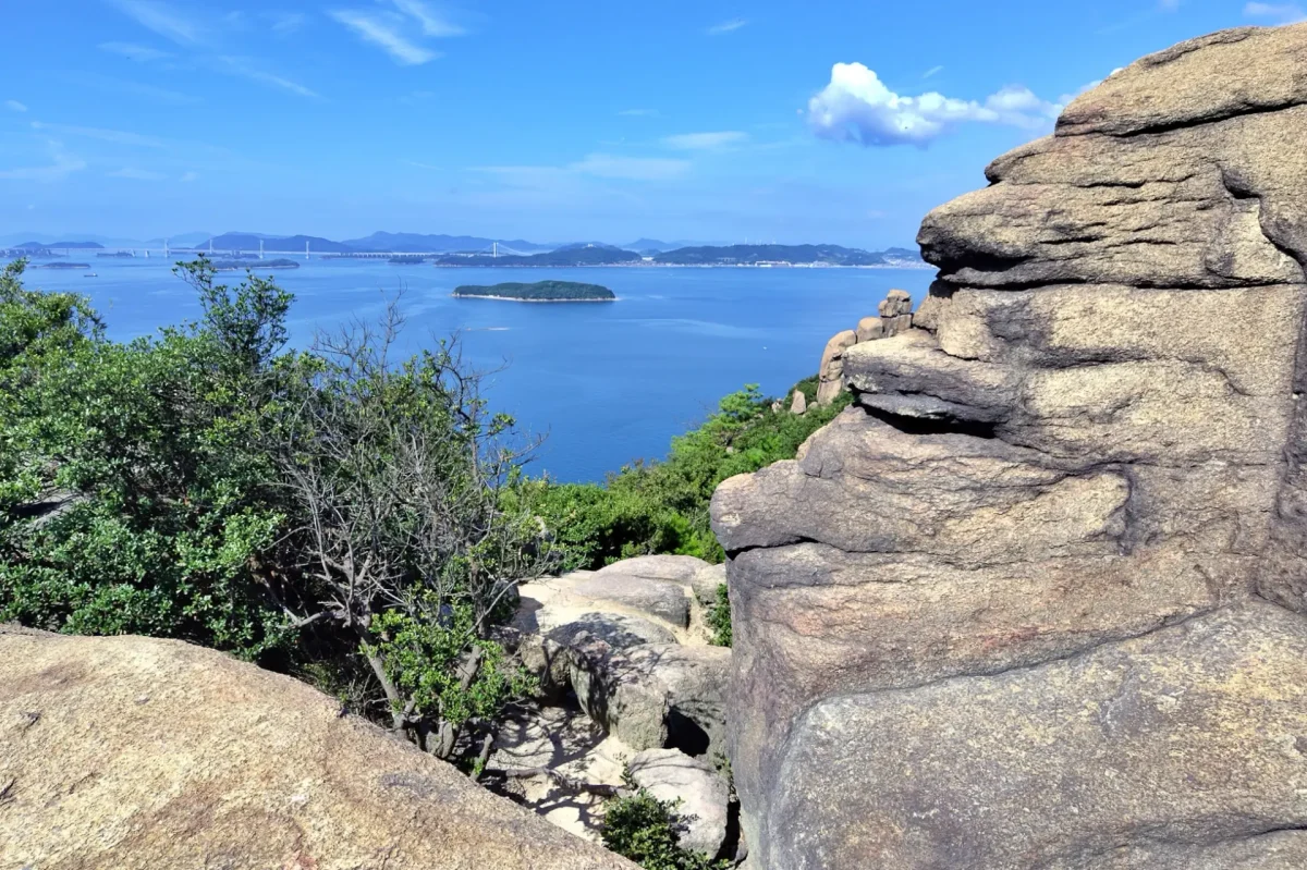 岡山県南部、倉敷市と玉野市にまたがる標高234mの王子ヶ岳は、山上に広がる巨岩・奇岩の独特の景観と、瀬戸内海の美しい風景を見られる絶好の展望スポット。バイクや車で登れる山頂付近には、遊歩道が整備されていて、「ニコニコ岩」などユニークなネーミングの巨岩巡りやスリリングな岩の上からの眺望を楽しめる。