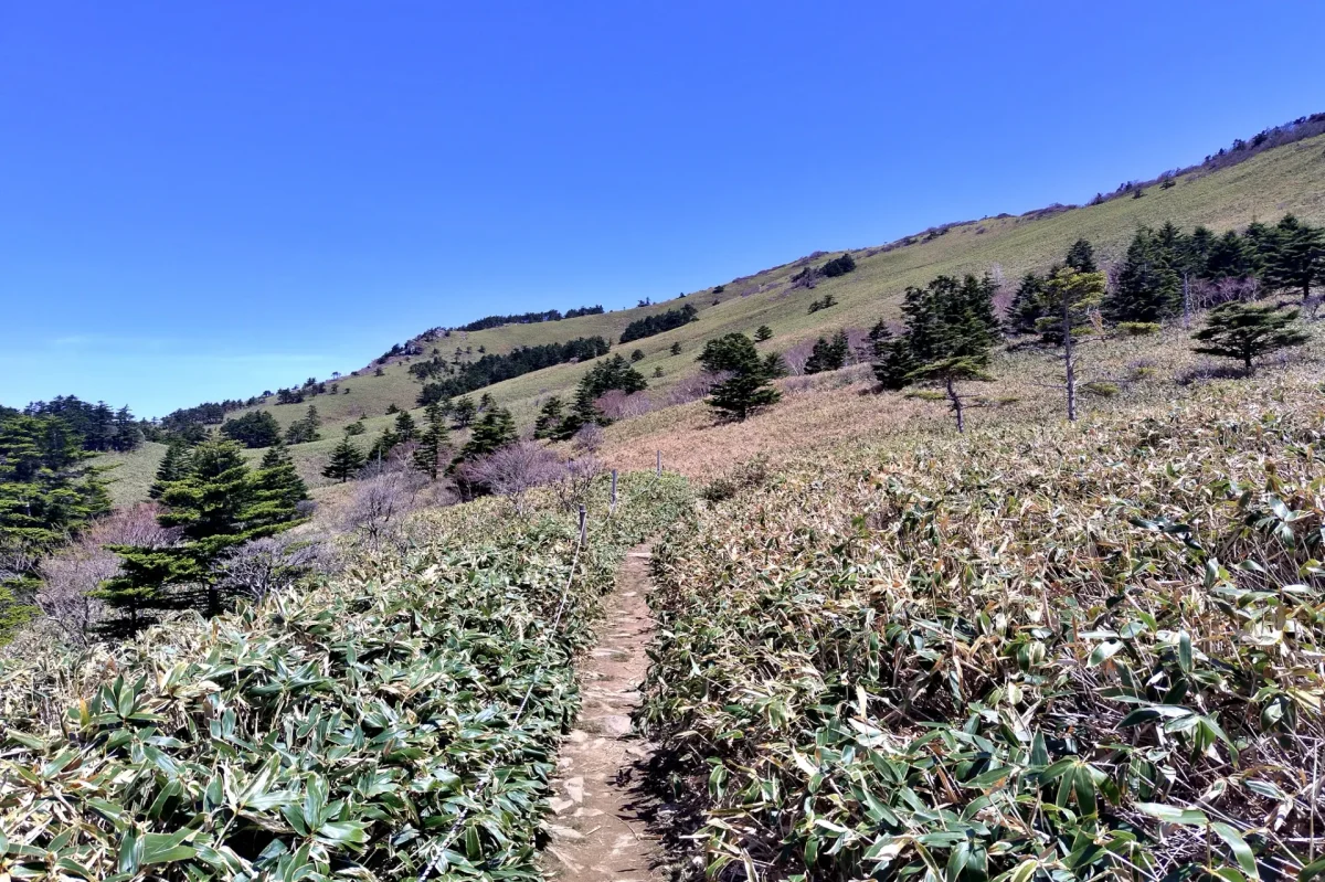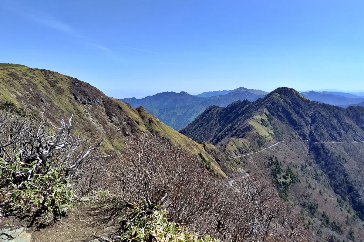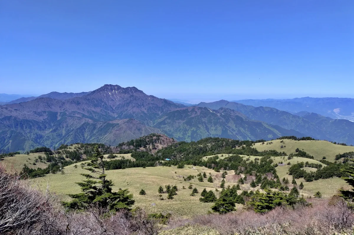 駐車場からは、男山(1830m)と女山(1897m)の二つのピークと美しい笹原が広がる「氷見二千石原」を巡る、1時間半程度の周回ルートがあり、瀬戸内方面や石鎚山系の山並みも見られて、「UFOライン」からの景色とは違った景観が楽しめる。