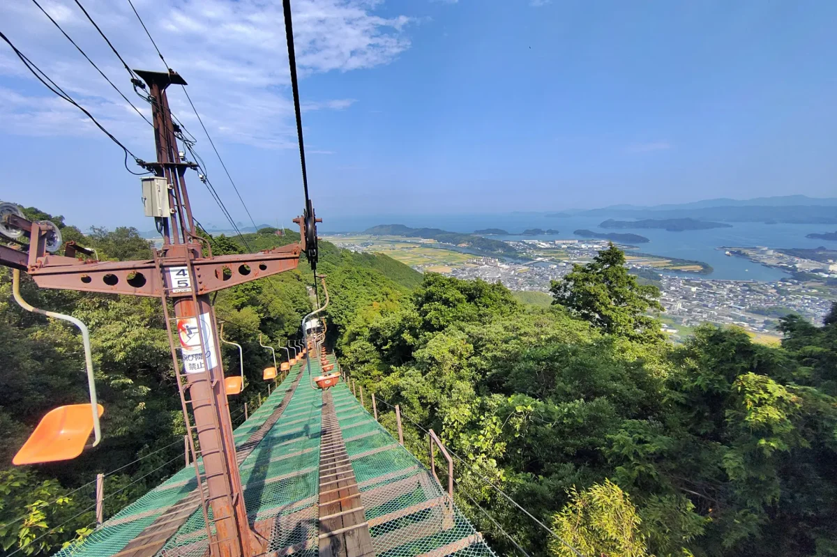 とくに下りリフトからの橘湾を望む展望は素晴らしくて、短い時間だが非日常的な空間を楽しめる。2025年4月から津峯スカイラインが、無料開放されて、原付でも通行できるようになった。ただし、自転車と徒歩は通行不可。