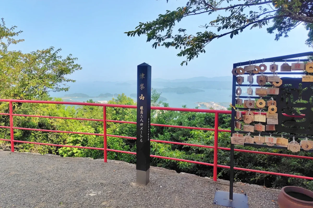 徳島県阿南市の標高284mの津峯山。山頂には「延命長寿と交通安全の守り神」と知られる「津峯神社」があり、約4kmの津峯スカイラインの終点駐車場から、参拝リフトか徒歩で登れる。