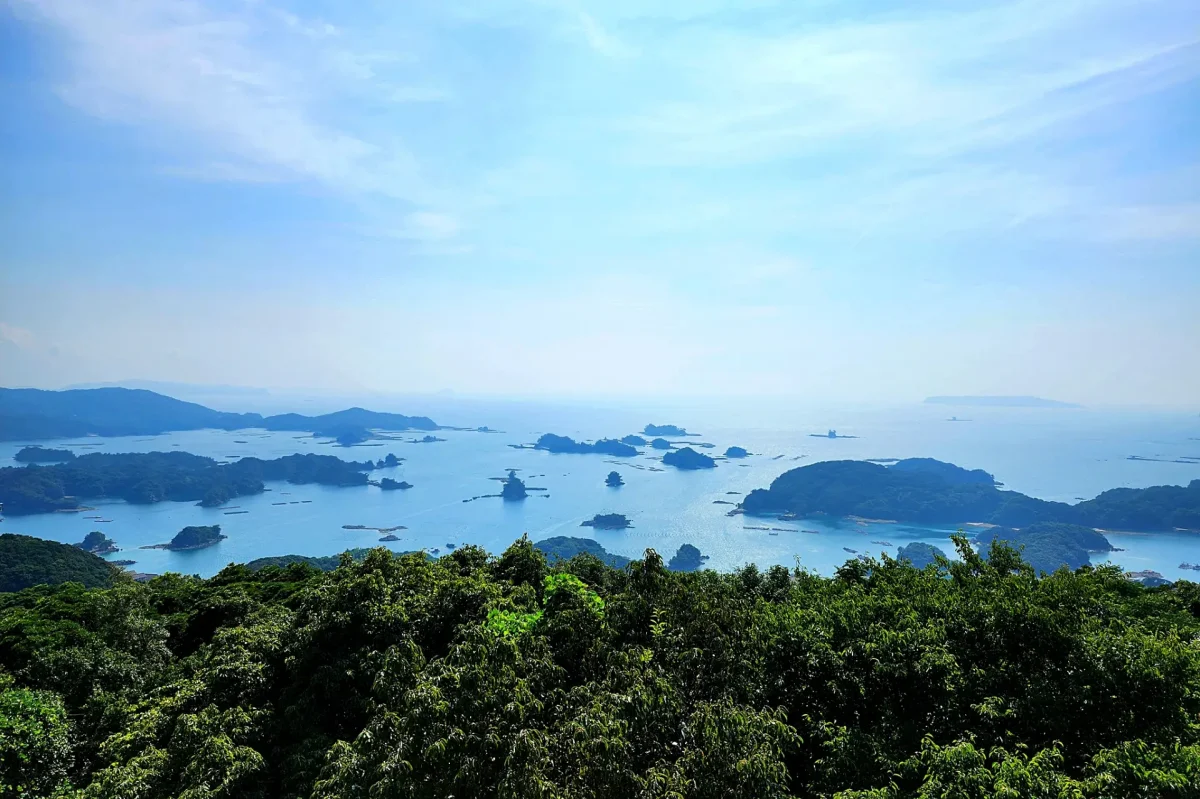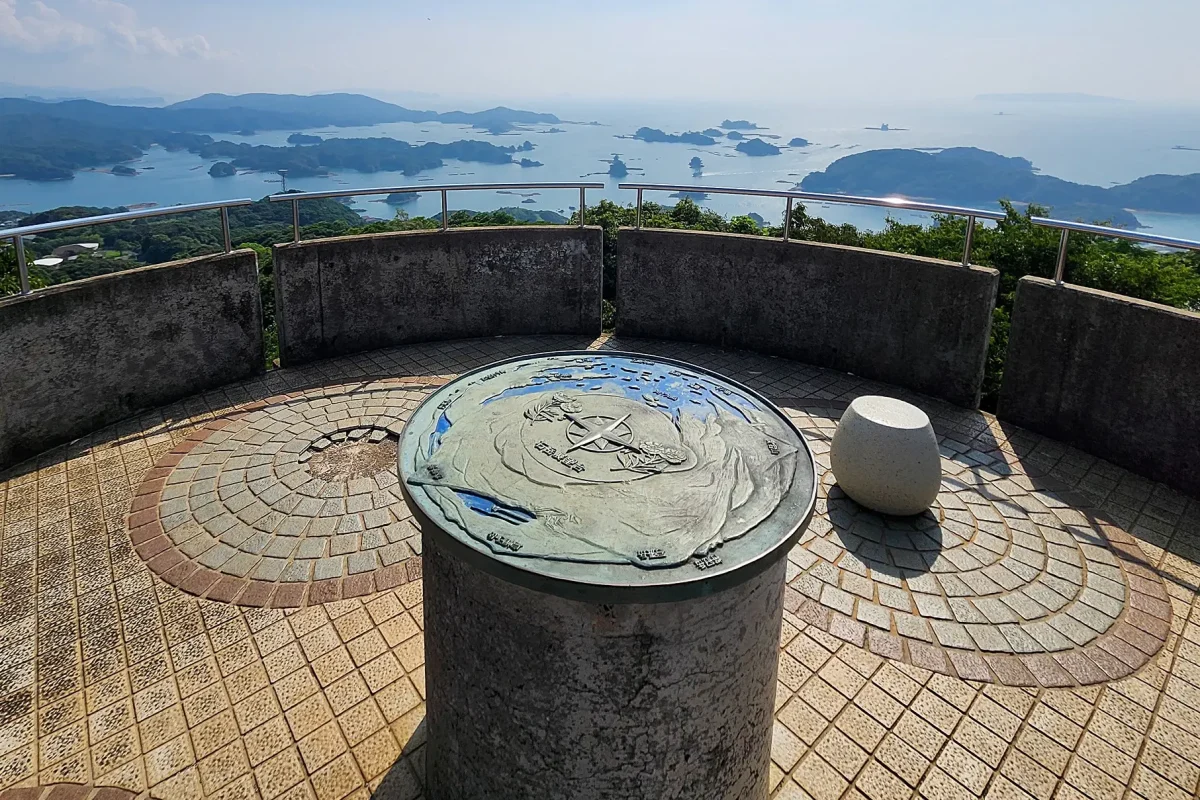 標高191m、「石岳」の頂上にある展望台から「九十九島(くじゅうくしま)」を一望できる絶好のスポット。駐車場からは展望台へ、木々に囲まれた遊歩道を歩くと、目の前に広がる風景…。実は映画「ラストサムライ」の冒頭に出てくる島々の風景を撮影したスポットでもあるそうで、数ある日本の絶景スポットから、ココが選ばれたのも納得の風景が目の前に広がります。