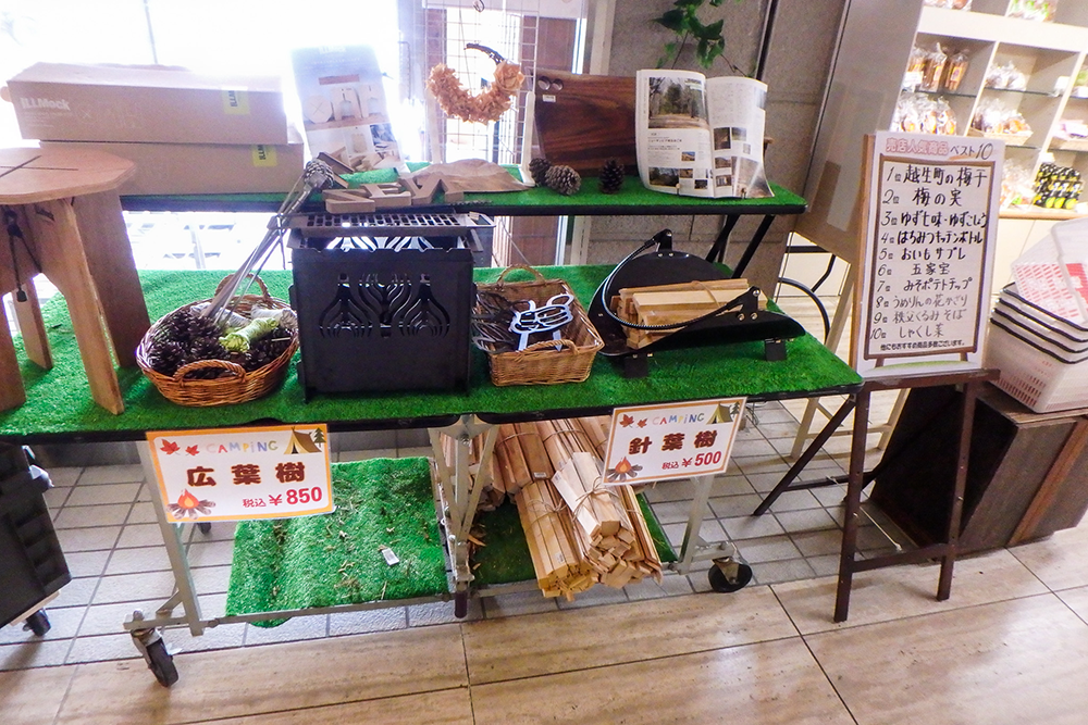 ▶受付・売店 キャンプ場の受付はニューサンピア埼玉おごせのフロントで。フロントの隣に売店(旅の駅)があり、地元の特産品なども販売。キャンプ用では広葉樹と針葉樹の薪も販売している。