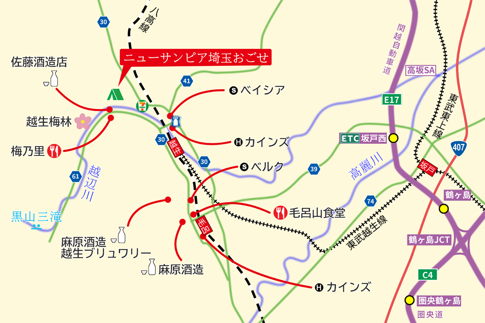 ベイシア 越生店(約3km):TEL 049-277-1110 埼玉県越生町西和田384 営 9:00~20:00 休 無休