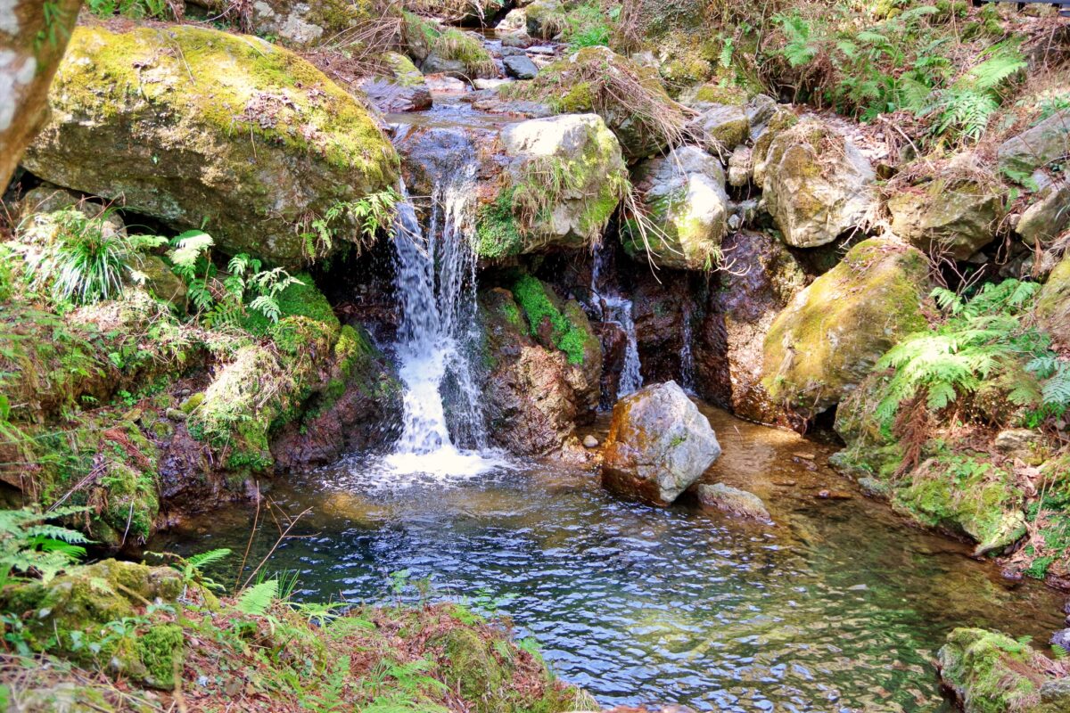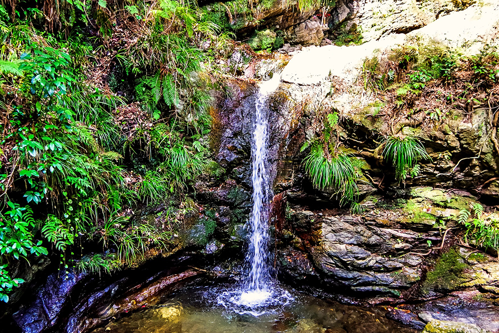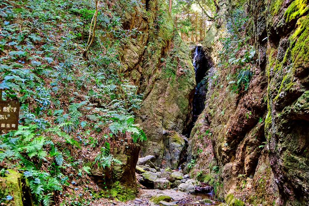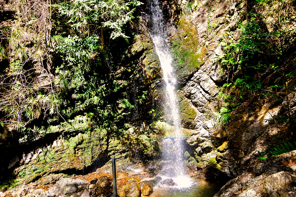 そこからしばらく進むと左手に天狗滝の看板がある。天狗滝を近くで見るにはそこを左に入っていくが、その道は狭く滑りやすい。注意しながらゆっくり滝に向かって進むも、残念ながら崖が邪魔をして天狗滝の全景を見ることはできなかった。そのまま道なりに行くと傘杉峠と男滝・女滝の分岐に出る。案内板に従い坂道を下って行くと、間もなく滝の音とともに男滝・女滝が見えてくる。滝は2段になっていて下が女滝、上が男滝でいずれも間近に見ることができる。