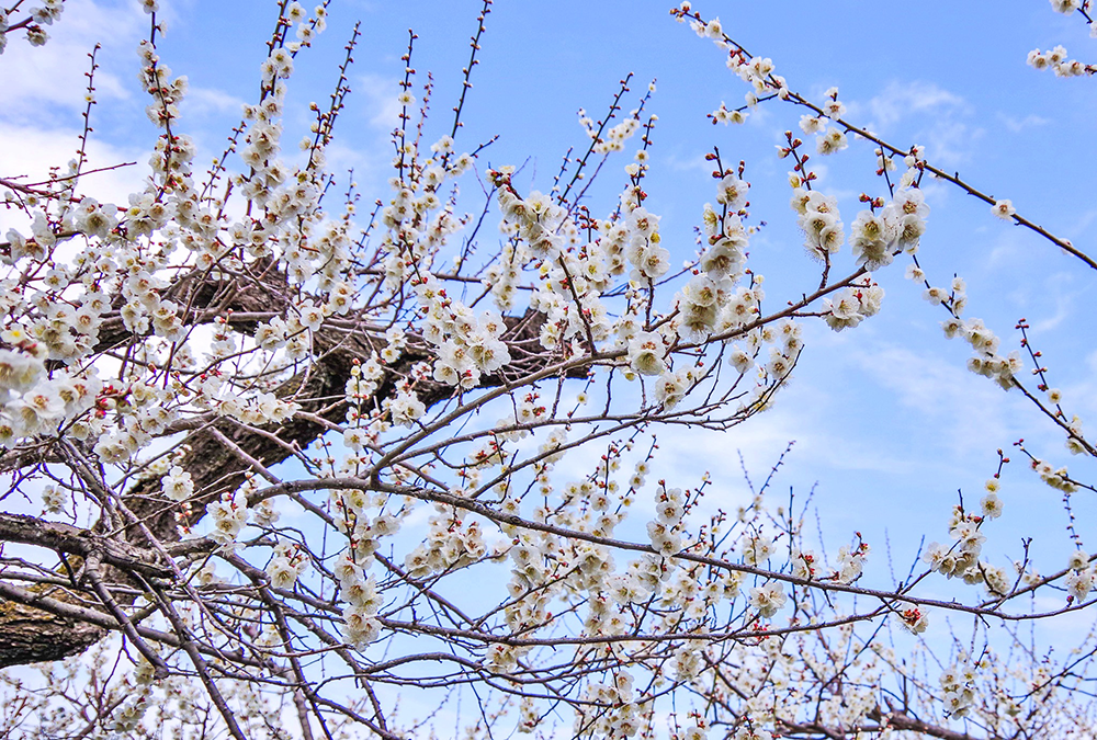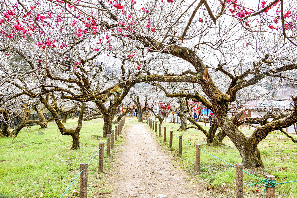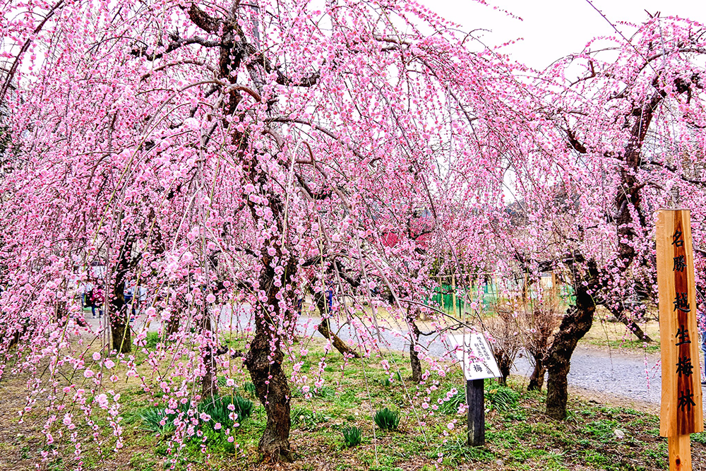 樹齢670年を超える古木「魁雪」をはじめ、白加賀、八重寒紅、越生べに梅など、約1000本、33種類の梅の木が植えられている、広さ約2ヘクタールの梅林。梅林周辺も含めると開花時期には約2万本もの梅が咲き誇るという。