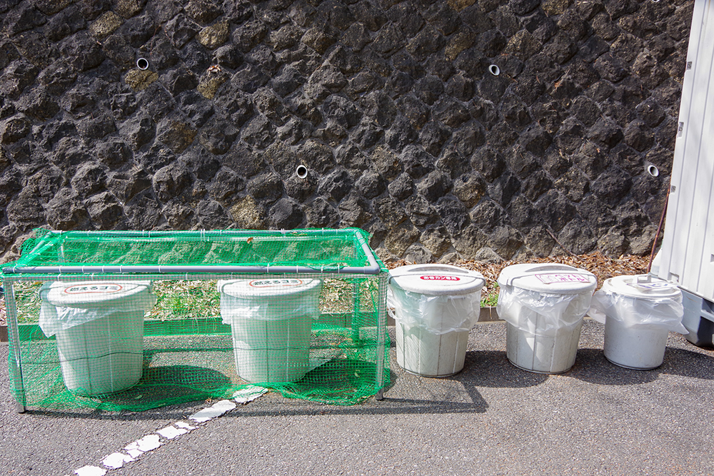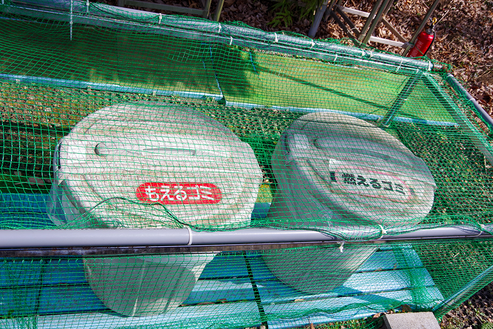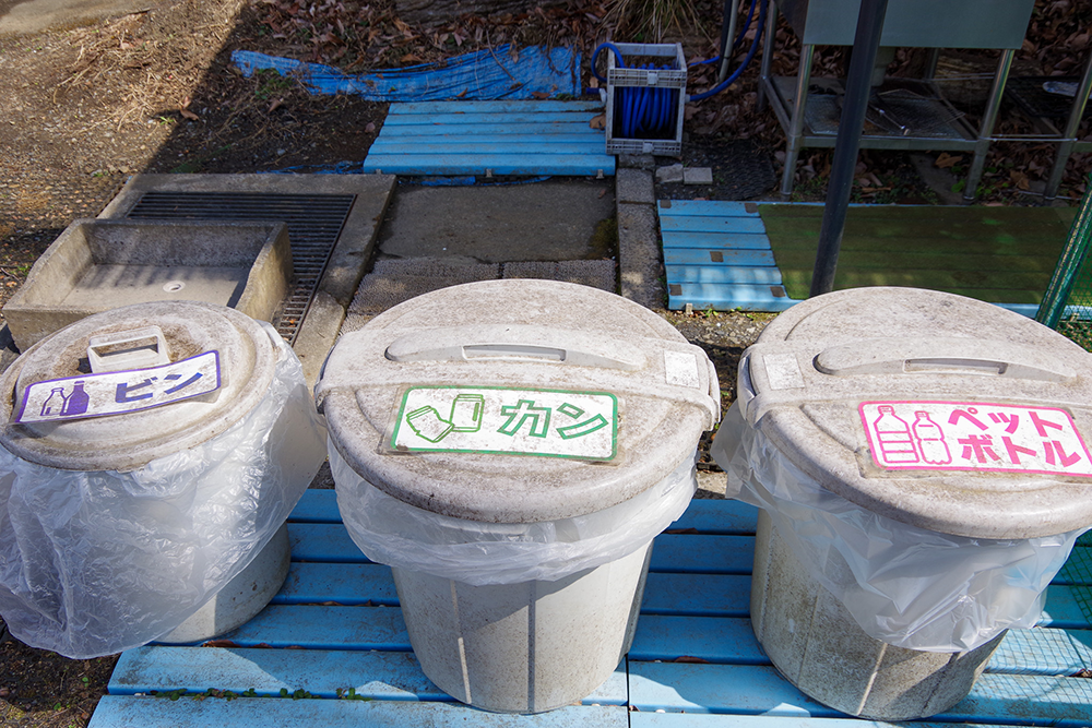 燃えるごみ/生ゴミ/ペットボトル/缶/ビン/ガスカートリッジに分別して専用ポリバケツへ。ただし生ゴミ用とガスカートリッジ用の専用捨て場はなかった。灰・消し炭は灰捨て場に。