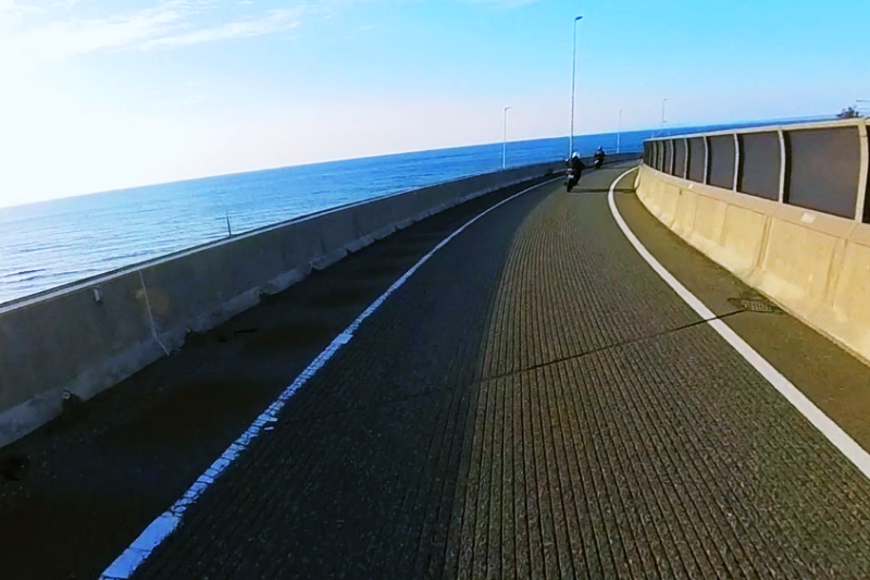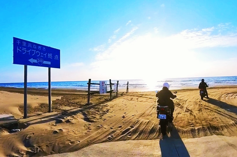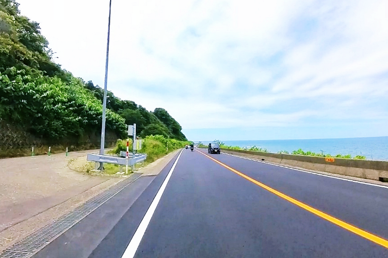 千里浜とは逆方向へ。対向の千里浜を目指すバイクが、我々に手を振りますが、きっとSSTRが終わって帰るバイクだと思っていることでしょう