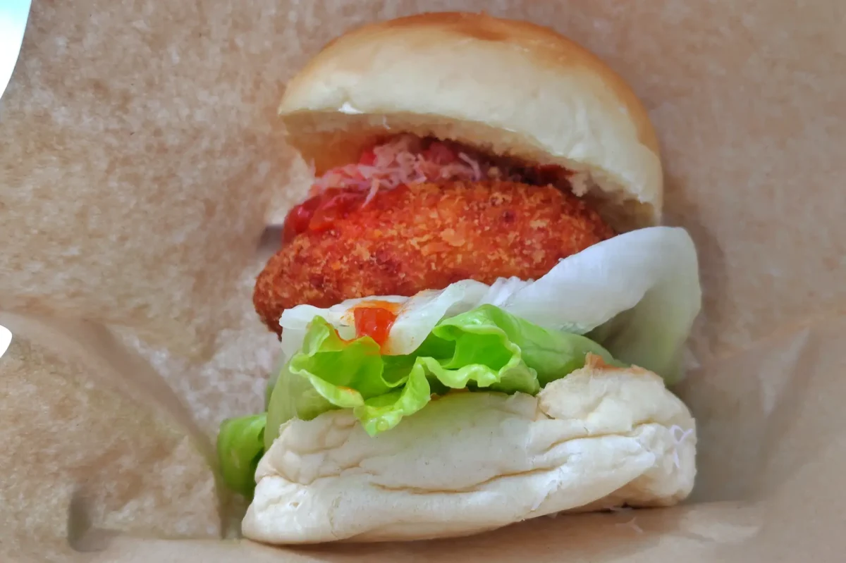 昼食のカニコロバーガー。SSTRで、「地元のグルメを昼食で食べる」、をついに達成