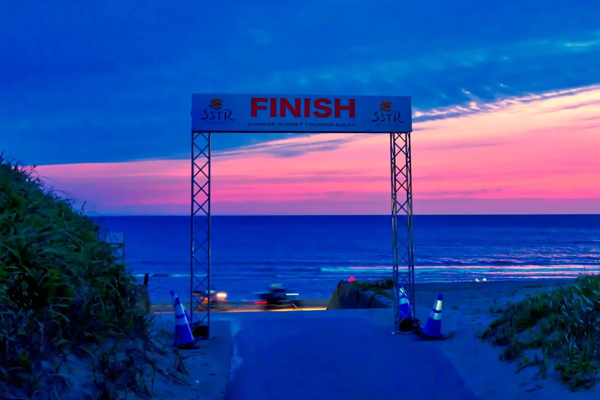 さぁ、あとは、「千里浜なぎさドライブウェイ」を走って、ゴールゲートへ向かうのみ。水平線の上には雲がかかっていましたが、海へ沈む夕陽はしっかりと見られました。