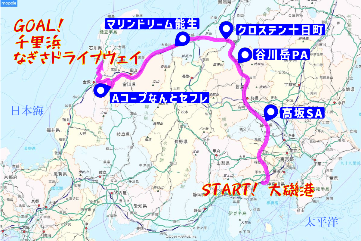 STARTは大磯港(神奈川県)。圏央道、関越道で新潟に入り、上越市で日本海へ。能生からは北陸道でGOALの千里浜(石川県)へというルートで走りました。