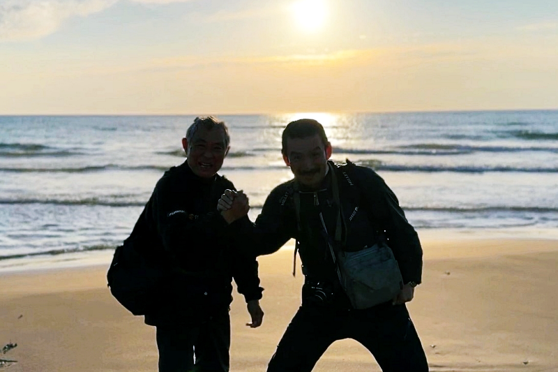 朝の大雨からは予想できなかった光景に、我々3人は「奇跡がおきた」と大興奮です。その、興奮さめやらぬうちに、千里浜なぎさドライブウェイ入口の今浜へ。いつもの公衆トイレ前で、最後のチェックインを済ませて、今回も無事完走です。