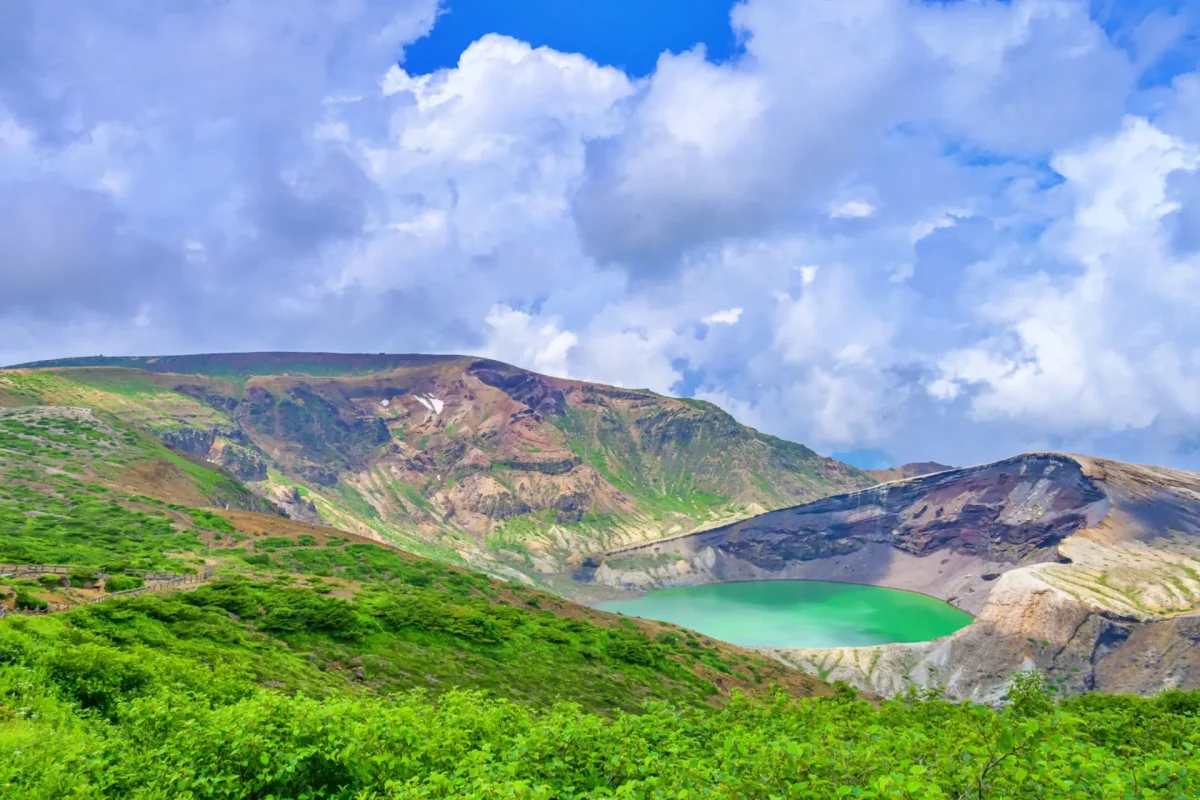蔵王の山頂からは火口湖の御釜を見下ろし、「御釜茶屋」で名物の「釜かつ丼」を食べられる。「刈田嶺神社(かったみねじんじゃ)」を祀る「刈田岳」(1758m)山頂まで簡単に登って行ける。蔵王エコーラインの宮城県側を下ると「遠刈田温泉(とおかったおんせん)」だ。