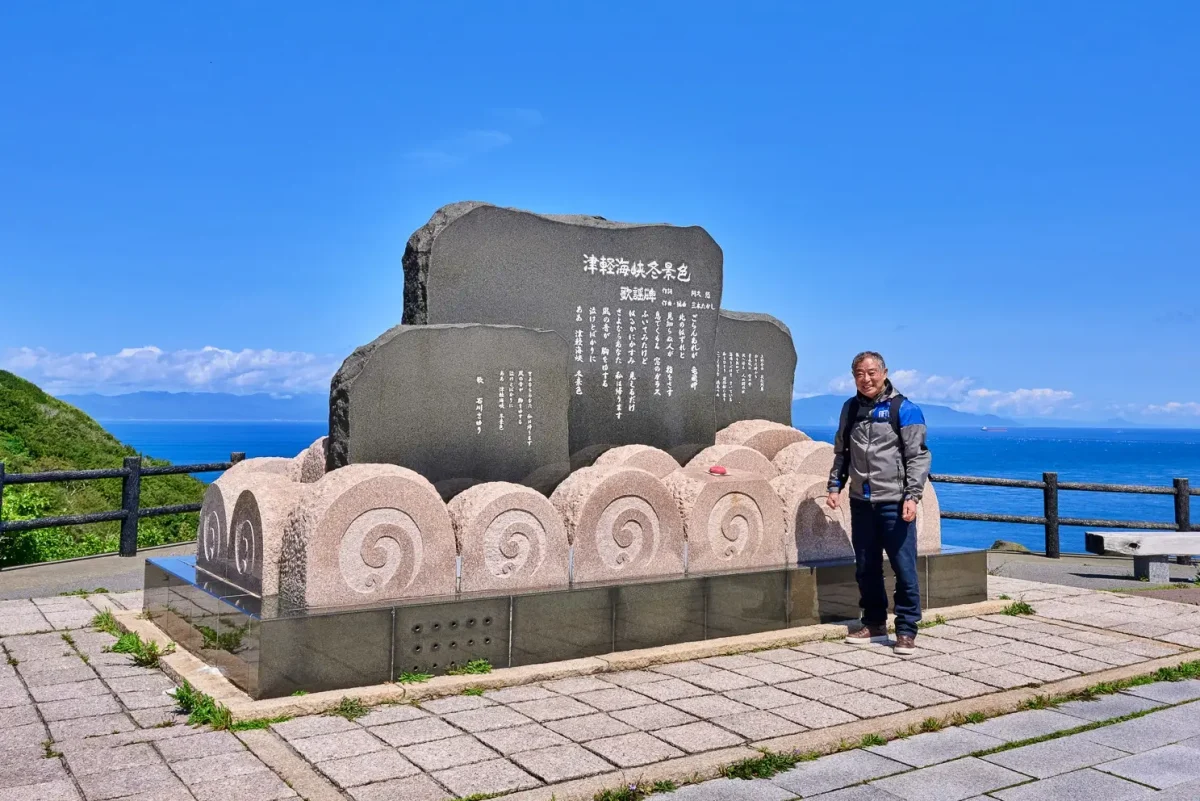 そして、尻屋崎の灯台は日本に数ある灯台の中でも一番絵になる、とぼくは思っているが、その近くには「本州最涯の地」碑が立っている。ここはまさに最涯の地。水平線上には北海道の山影が霞んで見える。その一番右は「恵山岬」になる。