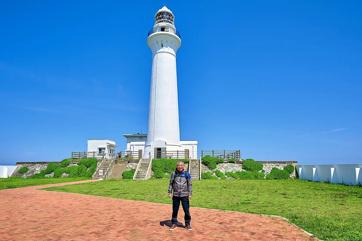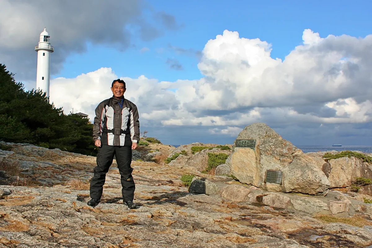 入道崎は北緯40度線上の岬。男鹿半島北端の岬で、周辺は広々とした園地だ。ここは秋田県内でも有数の観光地で土産物店やレストランが並ぶ。白黒2色の灯台に登ると岬周辺の海岸線を一望できて、眼下には水島を見下ろす。