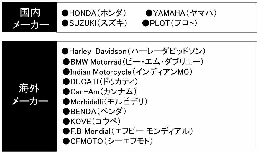 ・ヤマハ ・スズキ ・ホンダ ・コウベ・ハーレーダビッドソン ・シーエフモト・エフビーモンディアル ・カンナム