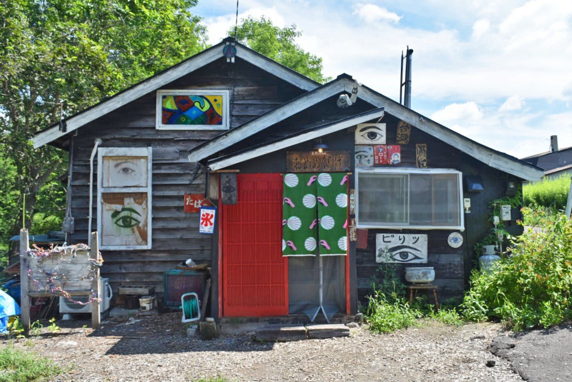 2025年5月にオープン。店名は、つげ義春の漫画『ネジ式』に登場する「メメクラゲ」に由来しており、外壁にあしらわれた無数の目玉が、その独特な世界観を象徴しています。遠目には古びた日本家屋に見えるものの、近づけば木の壁や雨戸、瓦屋根の軒先に大小さまざまな“目玉”が点在しており、どこか現実離れした空気をまとっています。
