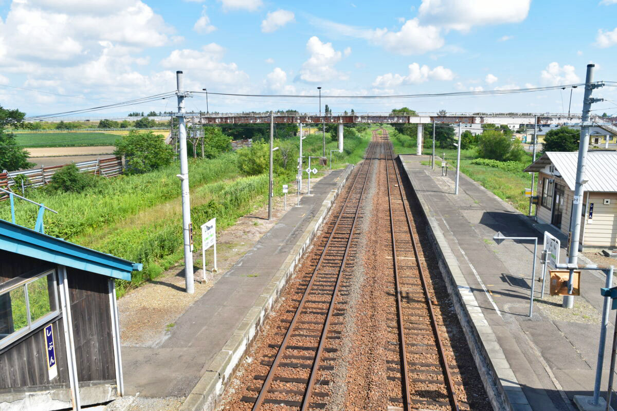 次に立ち寄ったのは、上志文駅跡。周囲は田園風景が広がり、近くには今も営業を続けるスキー場があります。札幌駅からスキー列車が発着していたホーム跡は雑草に覆われ、時間が止まったようです。線路跡は農道へと姿を変え、鉄道だった痕跡は、意識しなければ見落としてしまいそうです。