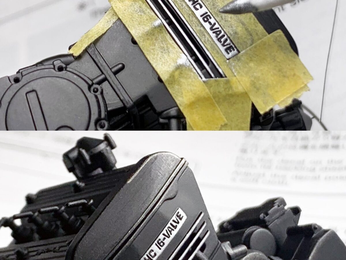 エンジンの刻印は極細の綿棒を使ったドライブラシで立体感を強調。シルバー塗装のパーツは黒立ち上げで影を残し、その上からエナメルシルバーのドライブラシを重ねることで使い込まれた金属の質感を表現しました。