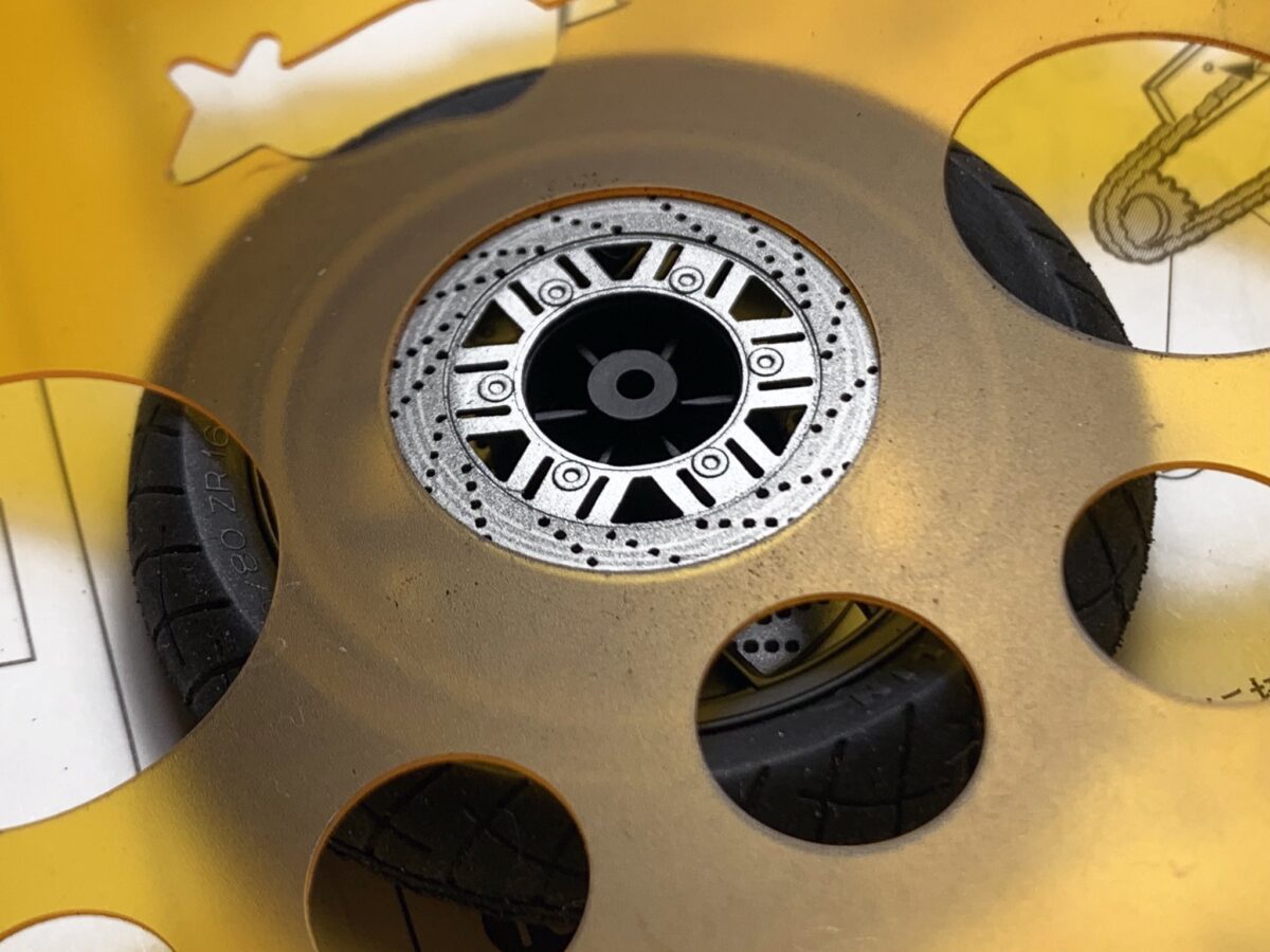 ブレーキディスクの擦り傷はテンプレートと鉛筆で描き込み、細部までリアルに仕上げました。
