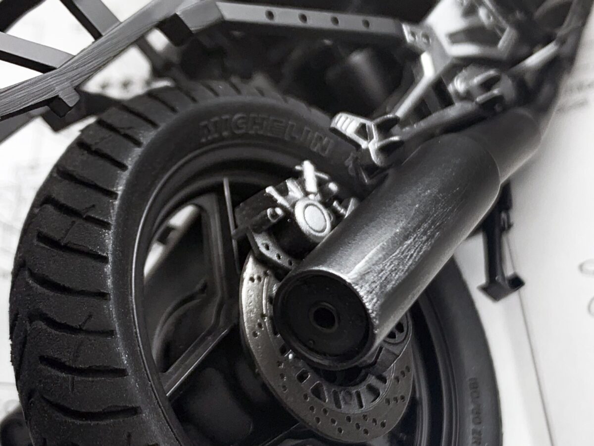マフラーの転倒傷は粗めのヤスリで削り込み、そこにシルバーを刷り込んで再現。