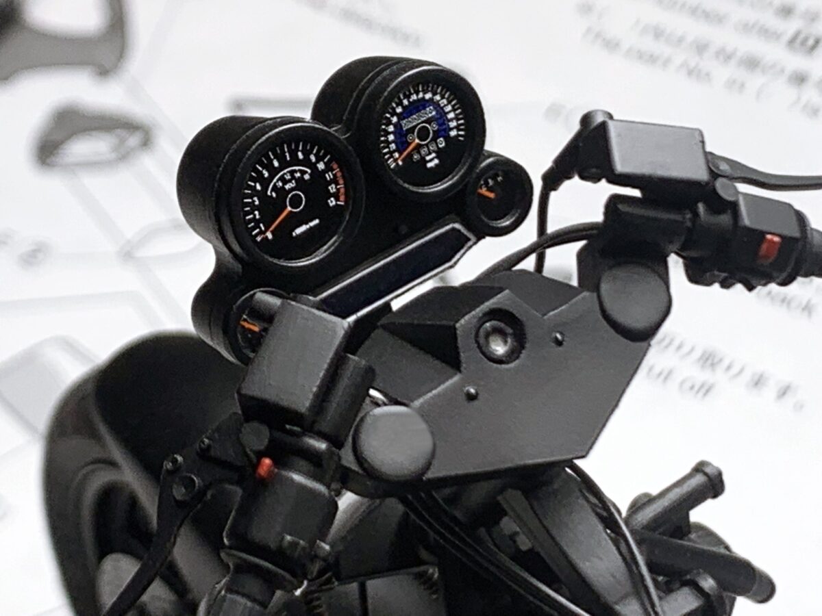マーヴェリック仕様のGPZ900Rにはトップブリッジハンドルカバーが装着されていると考えられるため、プラ板で自作。ノーマル状態では少しスカスカした印象になりがちなメーター周りの密度感が高まり、より実車に近い雰囲気となっています。