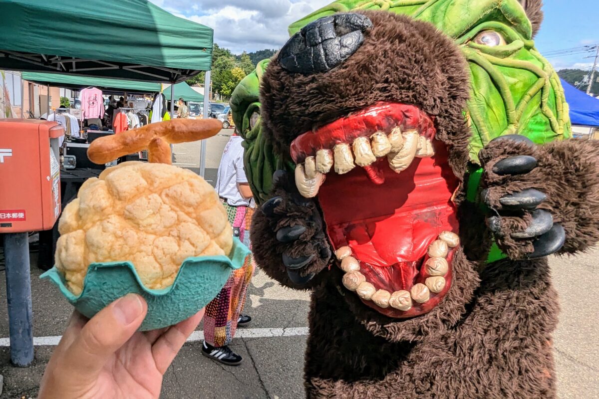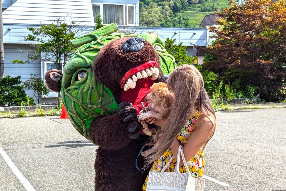頭部の割れたメロンからのぞく赤い果肉と種、そして血を思わせる赤い口元は、まるで怪獣やゾンビのような迫力。子どもを泣かせたり、若い女性に抱きついたりとやりたい放題で、犬でさえ吠えて警戒するほどです。