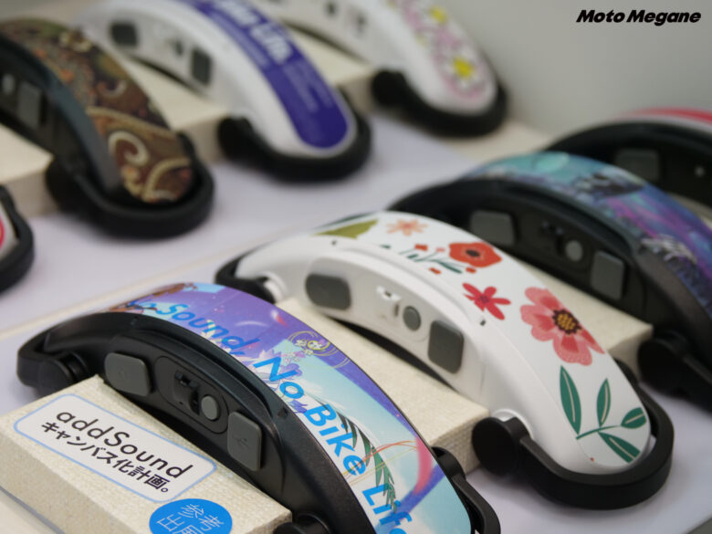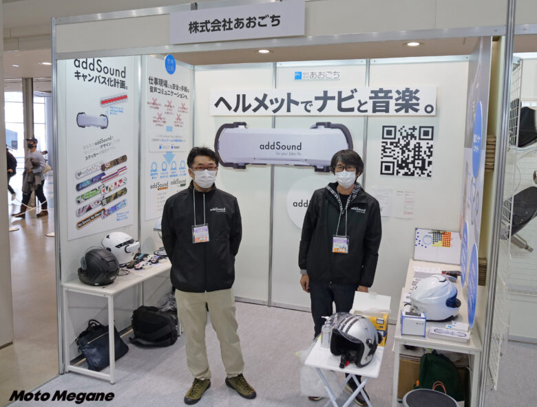 大人気の次世代型ヘルメット・オーディオ・システム「addSound」はもちろん、自分好みにカスタマイズすることでもっと楽しむことができそうな「addSound キャンバス化計画」や、現場作業や二輪配達員などの業務使用向けに開発された期待の新機種まで、注目商品が盛りだくさんの株式会社あおごちブースとなった。