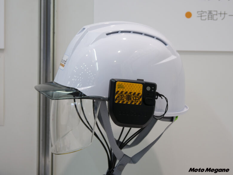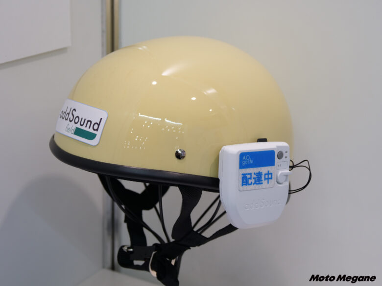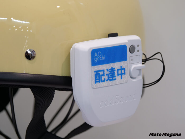 宅配サービスや工事現場など、フルフェイスの着用が難しい仕事現場での使用を視野に入れて開発したという「現場作業用 addSound」。半帽タイプでも取り付けられるコンパクトな本体は片耳だけスピーカーとなっている構造で、ヘルメットを被ったまま仕事のできる半帽タイプが主流となっている二輪配達作業や工事用ヘルメットを使用する現場作業まで、アイデア次第で色々な用途で活躍しそうだ。