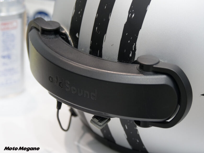 登場以降、大人気アイテムとなった「addSound」はスピーカーで直接耳を塞ぐことのない構造のため、適度に環境音を聴くことができる安全性やヘルメットにアタッチメントを取り付けておくことで簡単に脱着ができる手軽さ、走行状況に応じて音量を自動で調節してくれる機能や音楽の再生・停止はヘルメットをタップすることで操作できる「安全・簡単・快適」を追求したオーディオシステムとなっている。