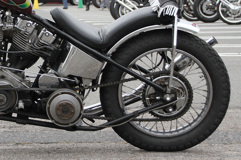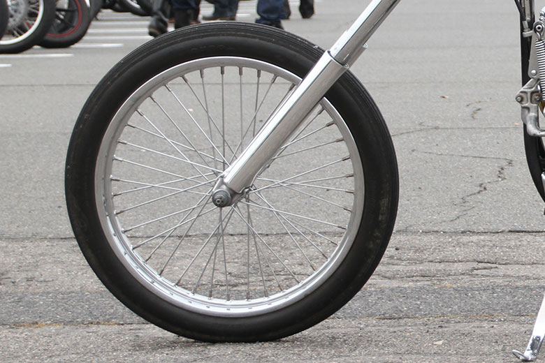 ホイール径を大きくするのもチョッパーカスタムのポイント。キャプテン・アメリカ号のベースモデルであるFLパンヘッドのホイール径は前後16インチでした。キャプテン・アメリカ号はそのホイールを21インチまで大きくしています。21インチというホイール、現代だとオフロードバイクでしか見かけることがないサイズですが、ナローなスタイルにロングフォークと大径ホイールを備えるのがチョッパーカスタムのマナーでもあったのです。