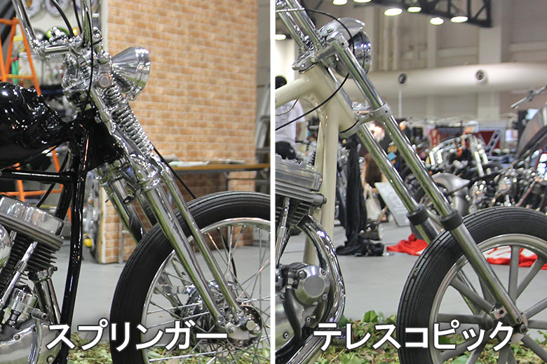 スプリンガー(もしくはガーターフォーク)かテレスコピック、チョッパーカスタムではこのいずれかがフロントフォークに選ばれます。スプリンガーフォークは1940年代までハーレーダビッドソンが採用していた当時もっともポピュラーな構造のフロントフォークで、1950年代より油圧式のテレスコピックフォークへと変わっていきます。どちらを選ぶかはライダーの好み次第。ちなみにスプリンガーフォークは現在のアメリカの交通法規では新車への採用が不可となり、メーカー販売モデルとしてはハーレーダビッドソン2009年モデルのFLSTFB ソフテイル・クロスボーンズが最後のモデルとなりました。