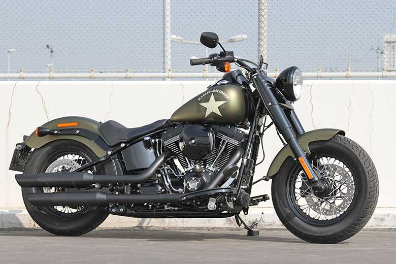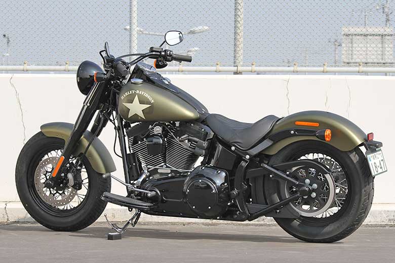 「スリムって」と ついツッコんでしまいたくなるネーミングですが、コンセプト通り無駄を削ぎ落とした ソフテイルファミリーのなかでもとりわけスポーツライドが楽しめるモデルです。そのコンセプトは、1950年代アメリカのダートトラックレースで活躍した「ボバー」と呼ばれるレーシングカスタム。当時ハーレーダビッドソンのモデルのホイールは前後16インチが基本で、フットワーク強化を目的に太いタイヤを履かせてグリップ力を高めていました。そのうえで、装備品はもちろん前後フェンダーまで短くカットし、「前後16インチホイール + ファットタイヤ」「油圧式フロントフォーク」「大きなヘッドライト」「ダートラ仕様バーハンドル」といったディテールから成るボバーが成熟していったのです。