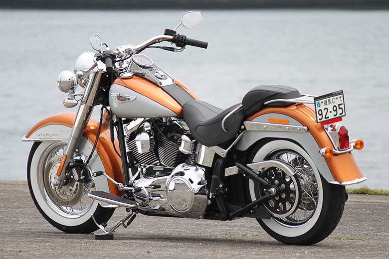 ソフテイルスリムと比較するとわかりやすいのですが、より軽量なスリムがスポーティな仕上がりなのに対して、サドルケースなど積載グッズこそないものの 重心がしっかりと定まったスタイリングから成るデラックスのライディングは安定感抜群で、身長160cm未満の方でも足つきに不安なく乗れ、それでいて乗りやすいという万能型モデルです。