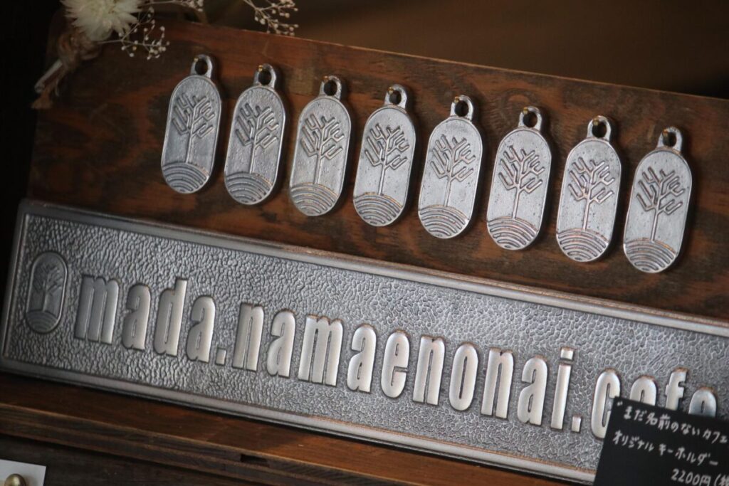 カフェの入り口にもかけられている鋳物のネームプレートとオリジナルキーホルダー、手がけたのはバイクの鋳物カスタムパーツメーカー FORK 長谷川 努さん。『まだ名前のないカフェ』をプロデュースしたハーレーダビッドソンのカスタムショップ『車坂下モトサイクル』だからこそのネットワークが生んだコラボ製品です。