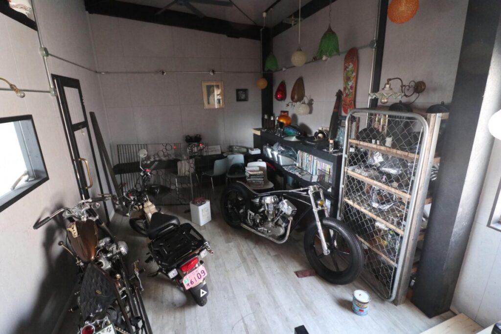 カフェの2階にある、国道4号線沿いのカスタムバイクショップ『車坂下モトサイクル』。お店の前のスペースが『まだ名前のないカフェ』に来店されるライダー用のバイク駐輪スペースになります。バイクショップ店内を通り抜けて階段を下り、カフェへと入っていくことができます。