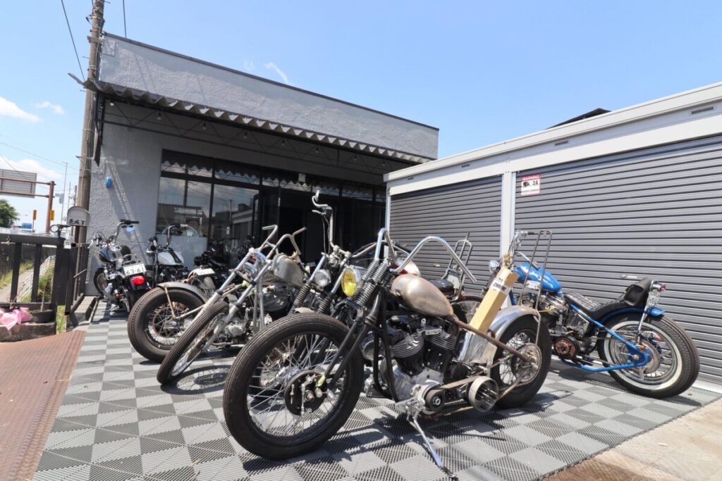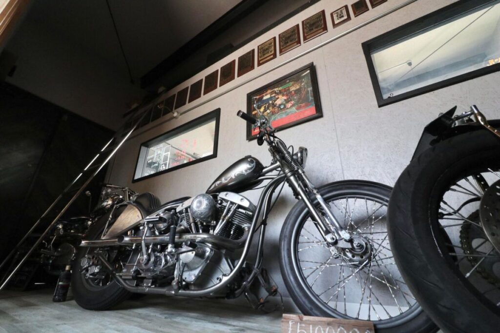 カスタムバイクショーでも拝見したフルカスタムハーレーがさりげなく佇んでいるところも『車坂下モトサイクル』ならでは。